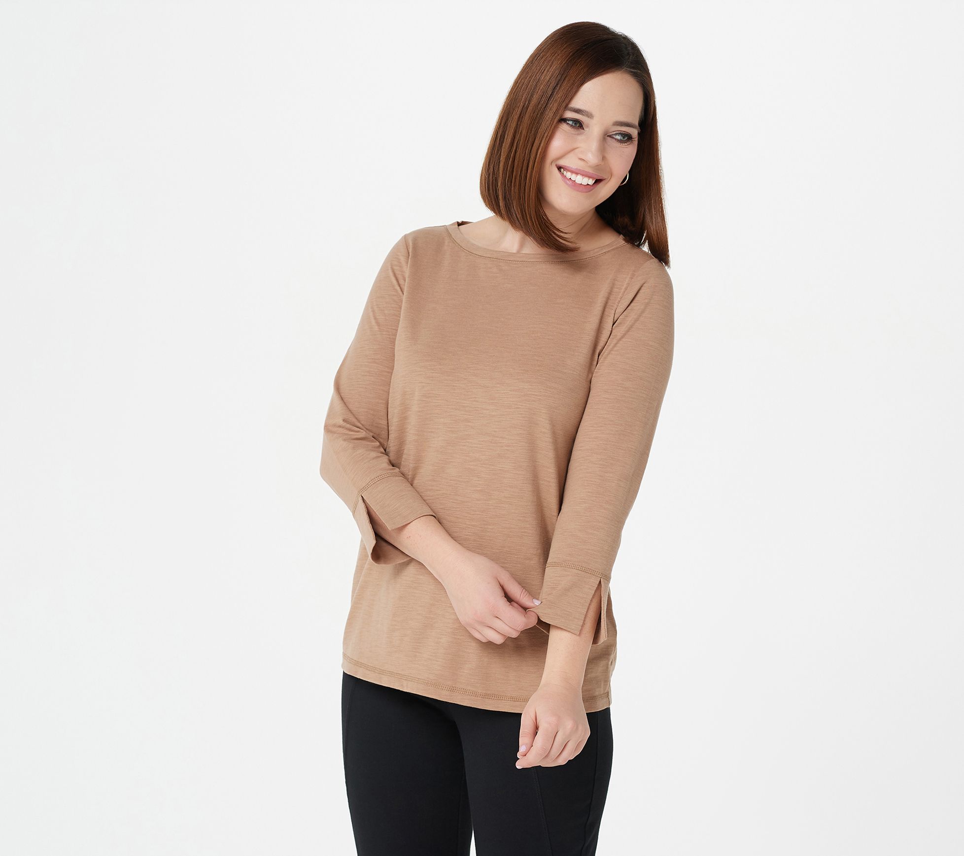 • Top Features: bateau neckline, 3/4-length sleeves, cuff detail, straight bottom hem