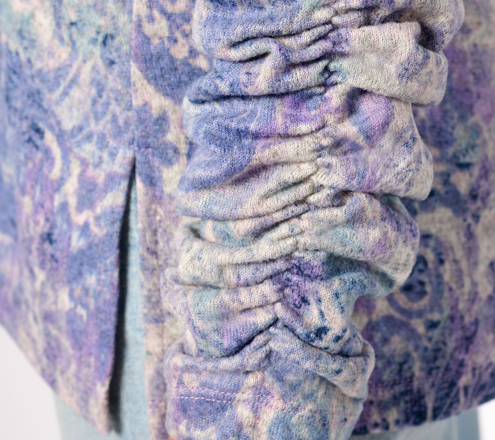 • Features: slightly twisted cowl collar with seam at center back, set-in long sleeves, ruching details at sleeve opening, straight hem with side vents, print