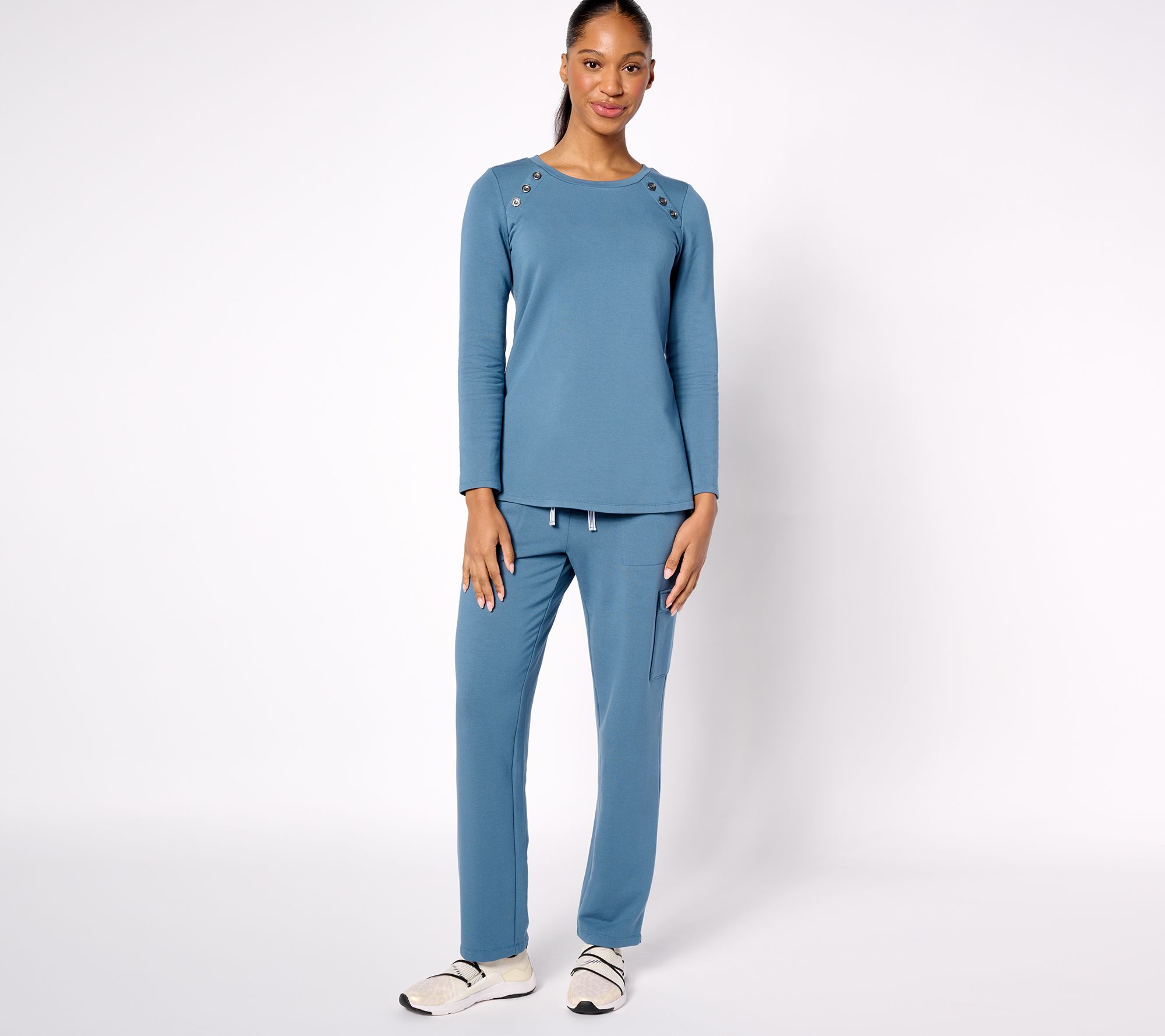 Features: scoop neck, folded neckband, angled non-functional button details, long sleeves, straight bottom hem, side hem slits