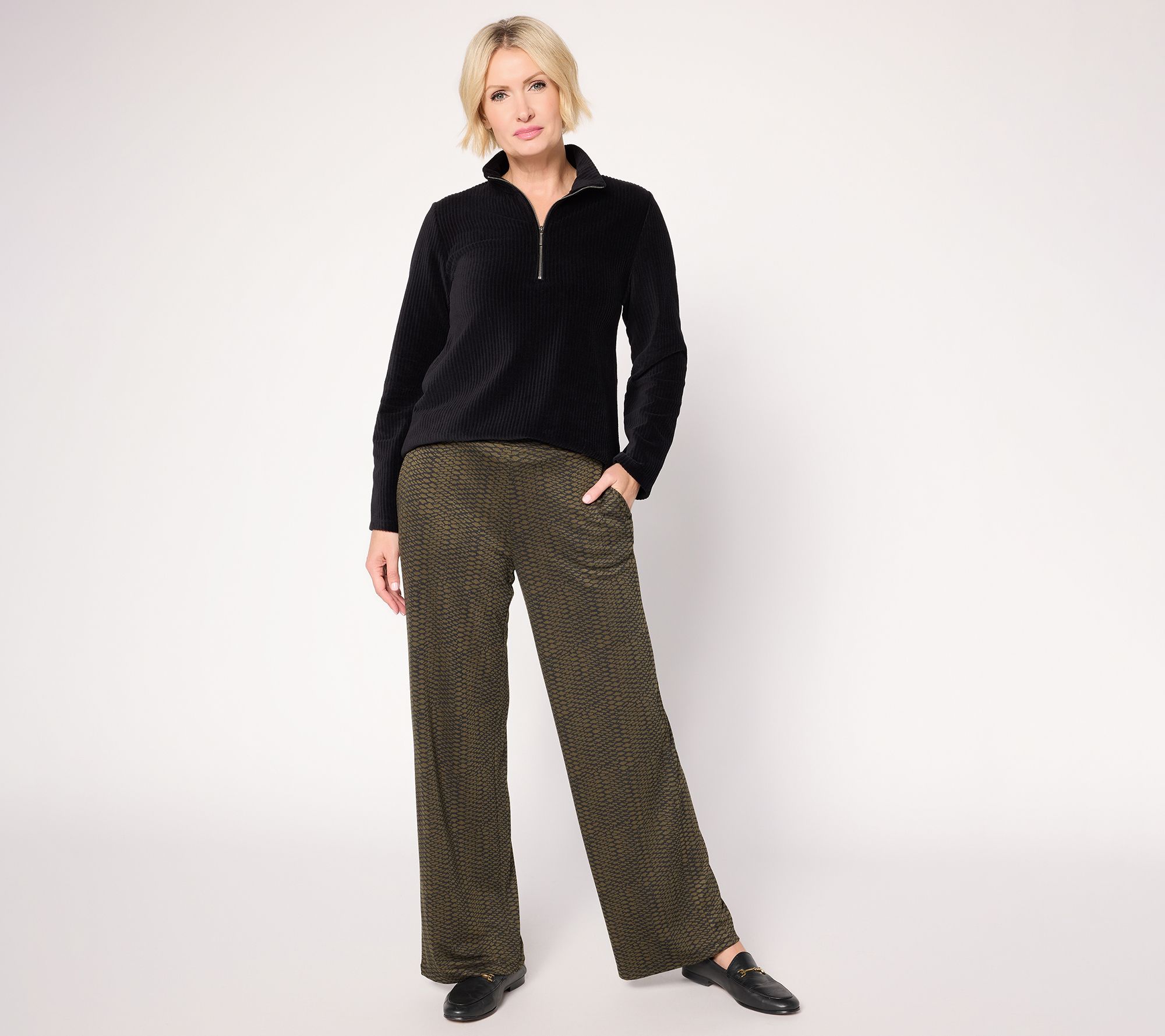 Thought you didn't have anything to wear to that last-minute lunch? Think again! Susan Graver's jacquard knit pants bring subtle two-toned print detail and everyday ease to your outfit. The drapey fabric gently skims the body, while the easy pull-on design and functional on-seam pockets make getting dressed a breeze From Susan Graver.