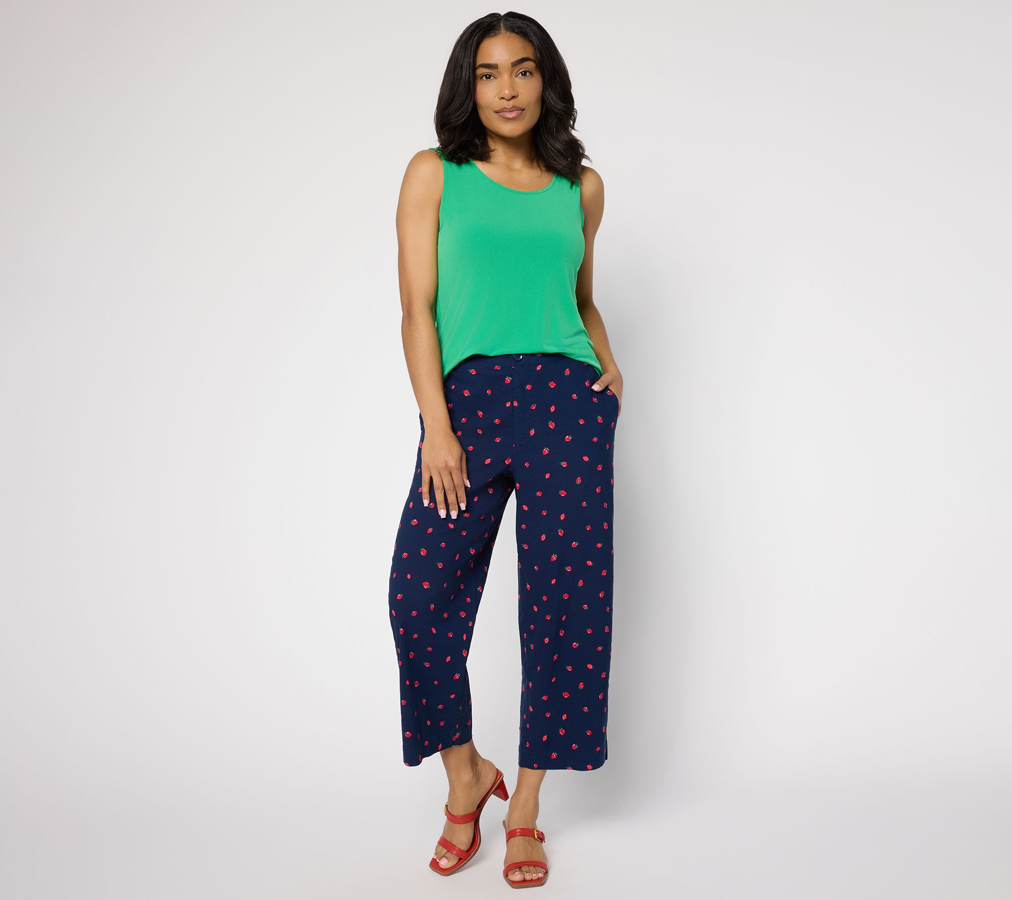 A sweet alternative to jeans and shorts, these cute crop pants stand out with an allover print. The flat front waistband provides a sleek look, while the gathered elastic back (and a touch of stretch in the fabric!) creates a comfy fit. From Susan Graver.