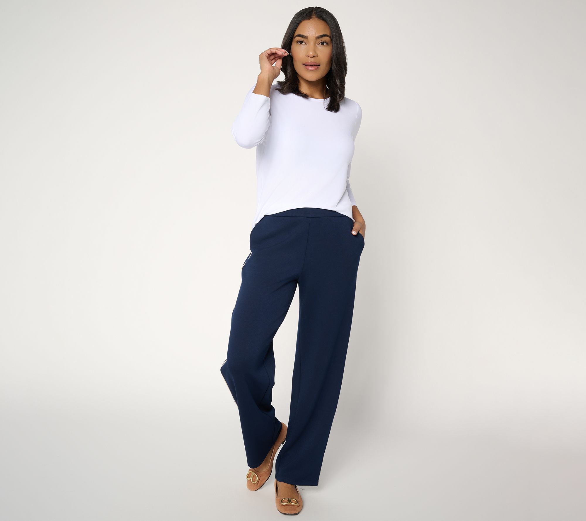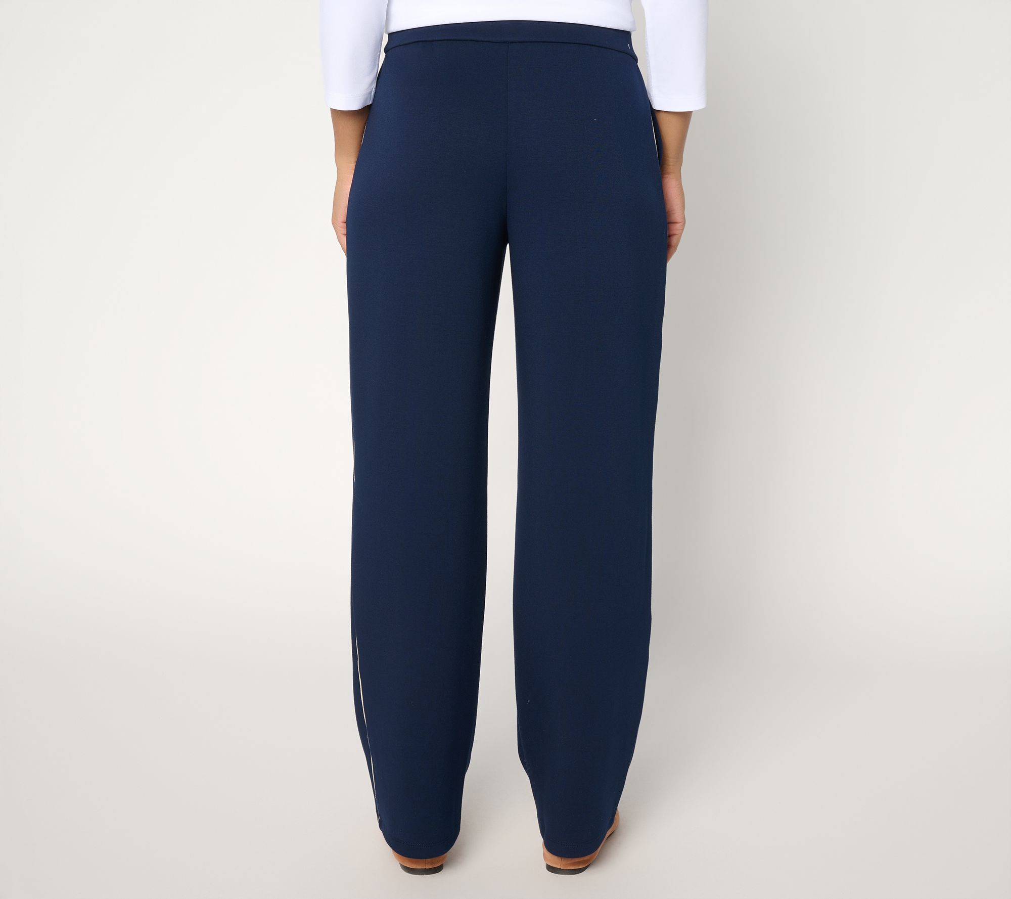 Ease into daily routines with these Serene Knit pants, offering a pull-on waistband, flowy wide legs, and crisp side piping. Front pockets hold essentials as you move from brunch to afternoon outings (or the office to happy hour), while their soft hand-feel helps you stay in your comfort zone. From Susan Graver.