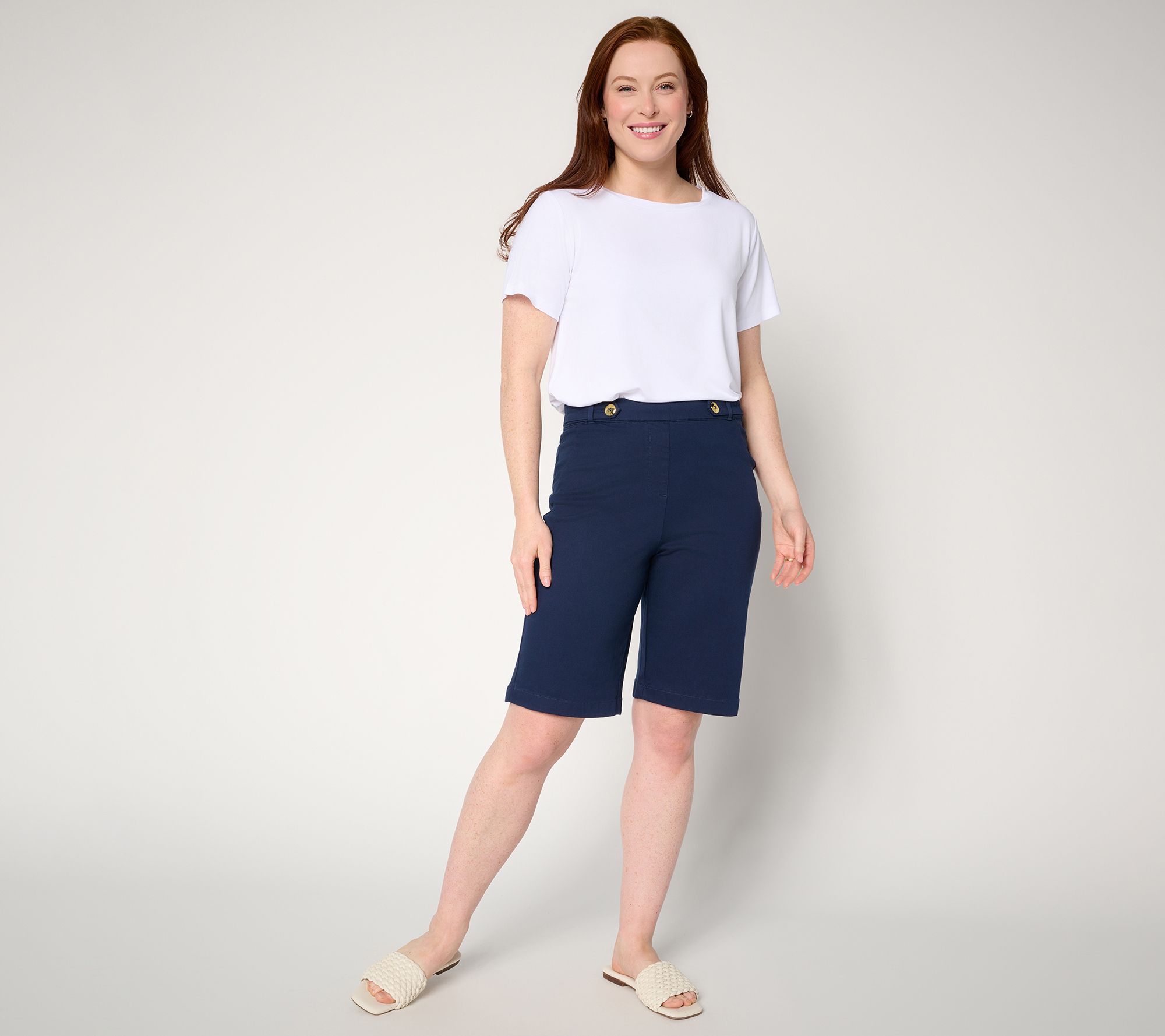Polished details, please -- but keep things comfy. Done! These best-ever Bermudas with shiny button details at the waist flex with your every move this sunny season, thanks to their stretch cotton-blend fabrication. Picture them with mules and a button-front shirt, or try a tucked tee and sparkly sandals for a dressy-casual moment. From Susan Graver.