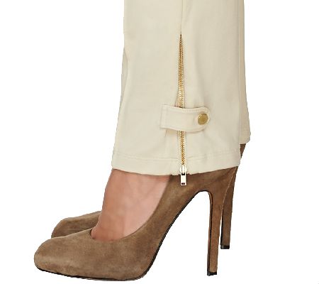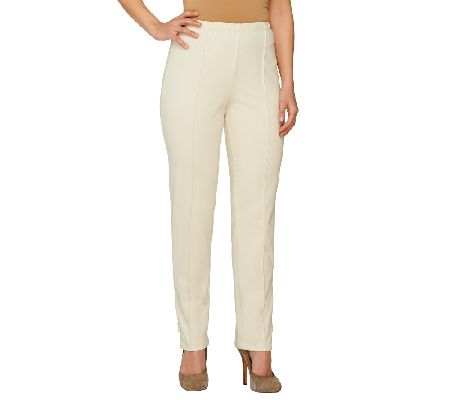 A sleek, chic silhouette. Featuring an elastic waistband, vertical stitch pleating on the front, and a zipper with a button tab detail at the leg openings, this pant is a sophisticated look for any fashion-forward woman. From Susan Graver.