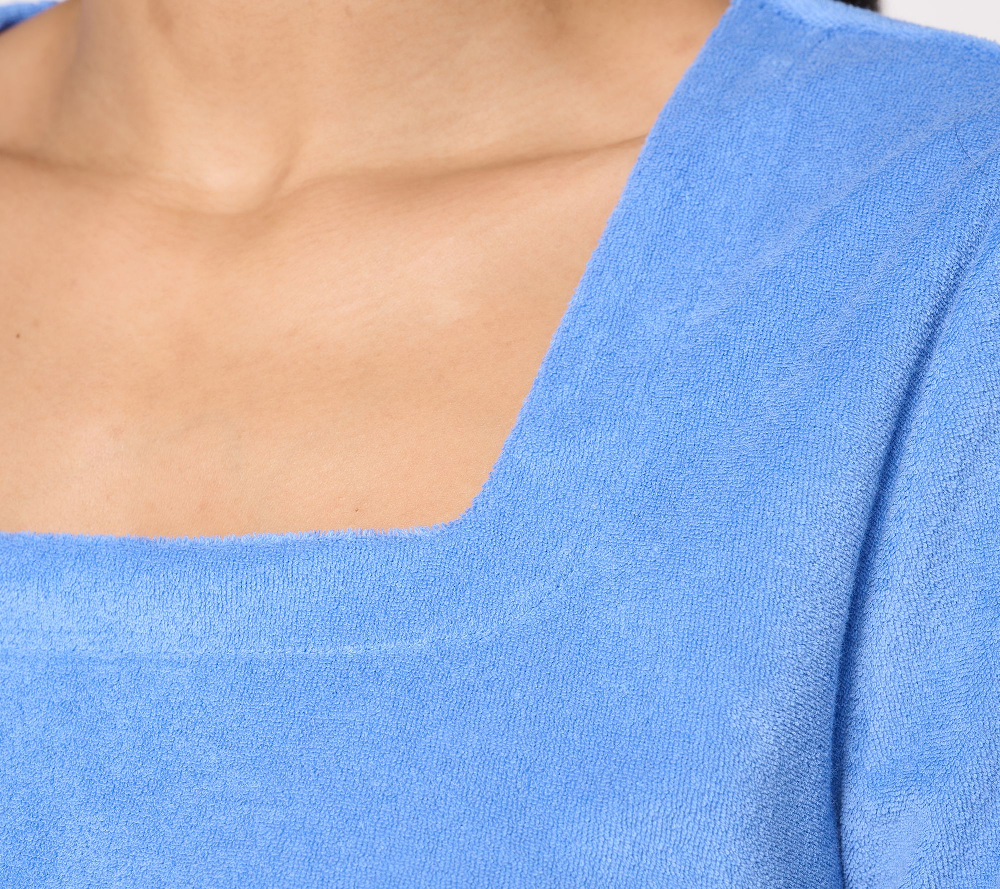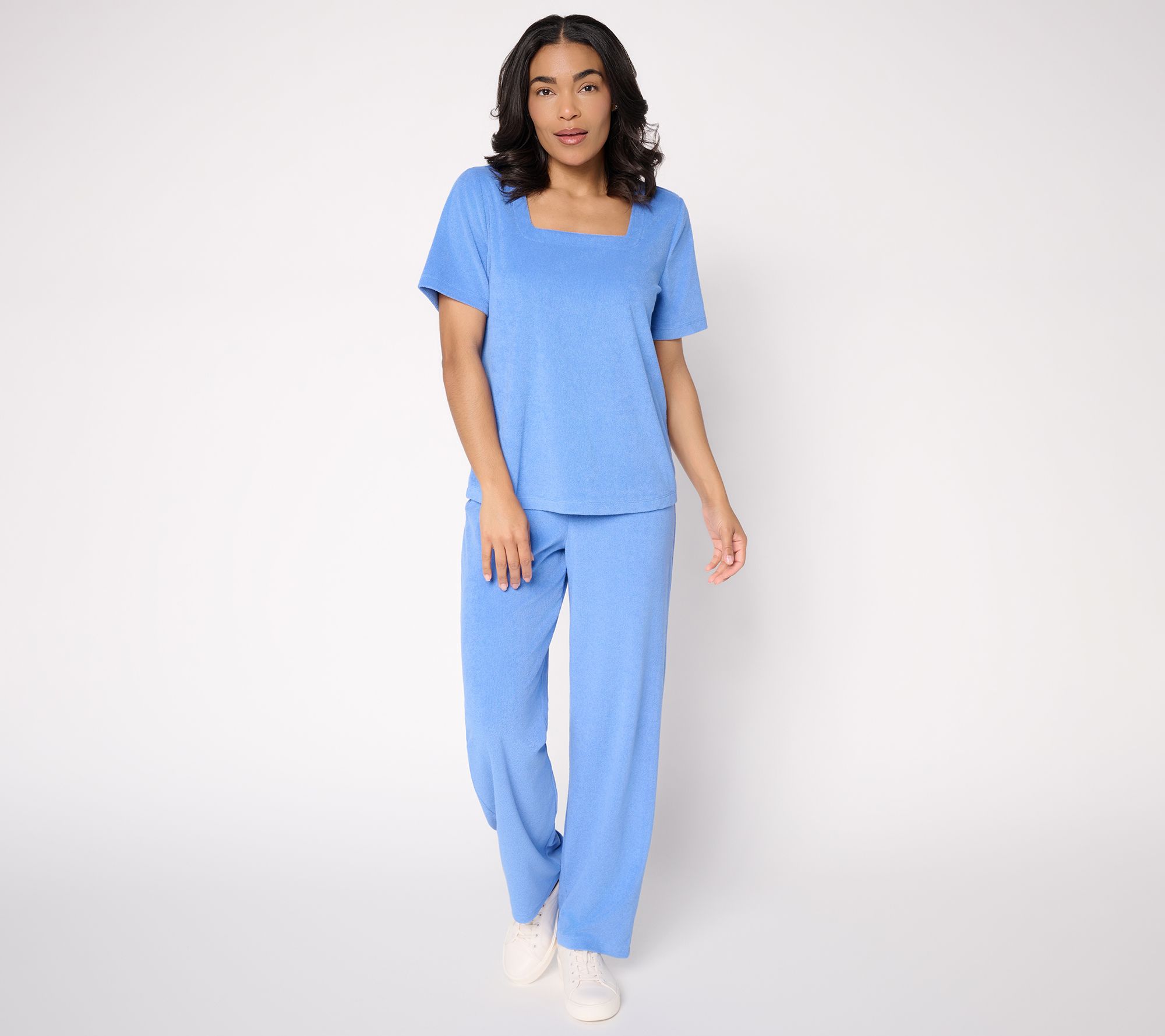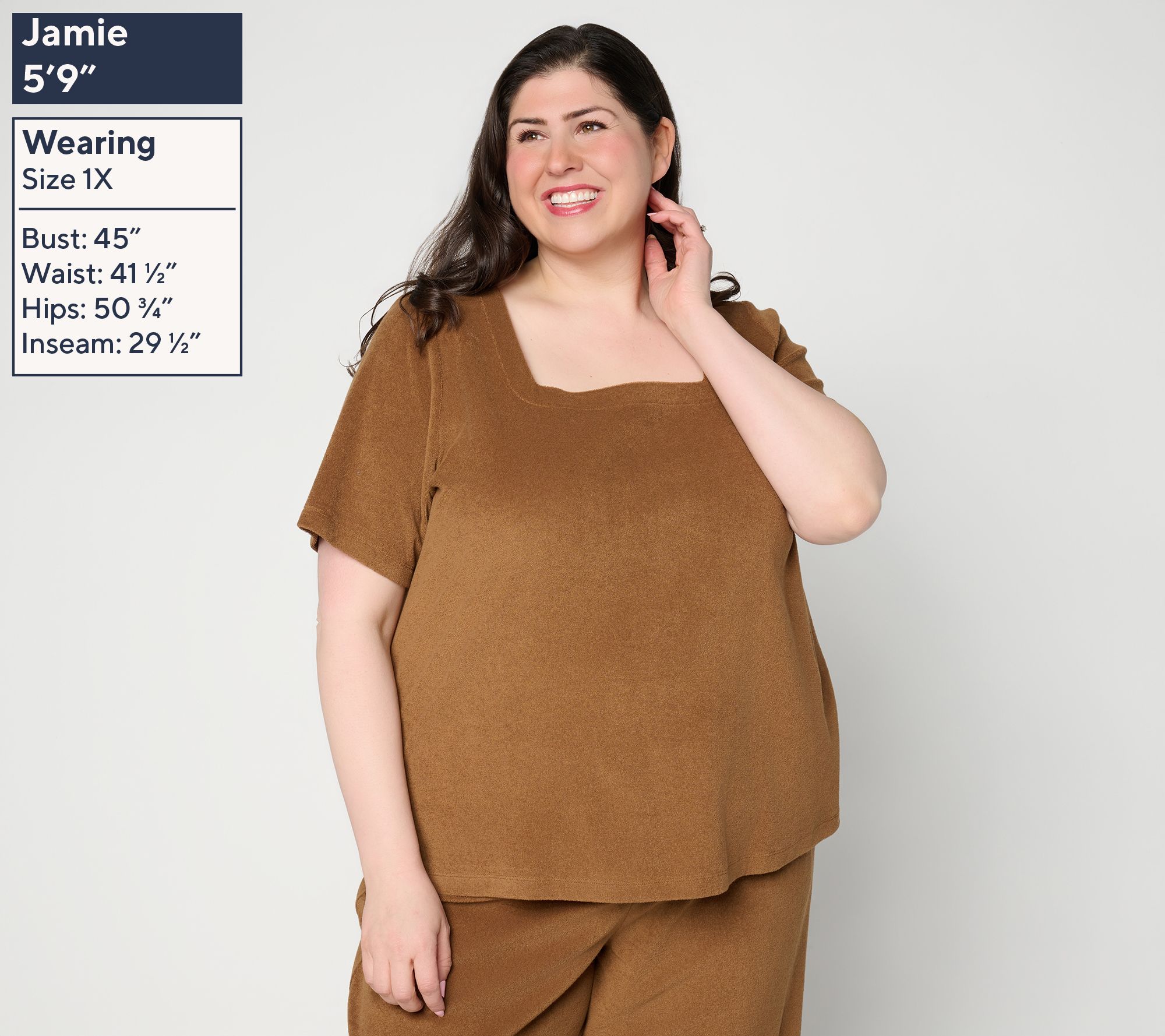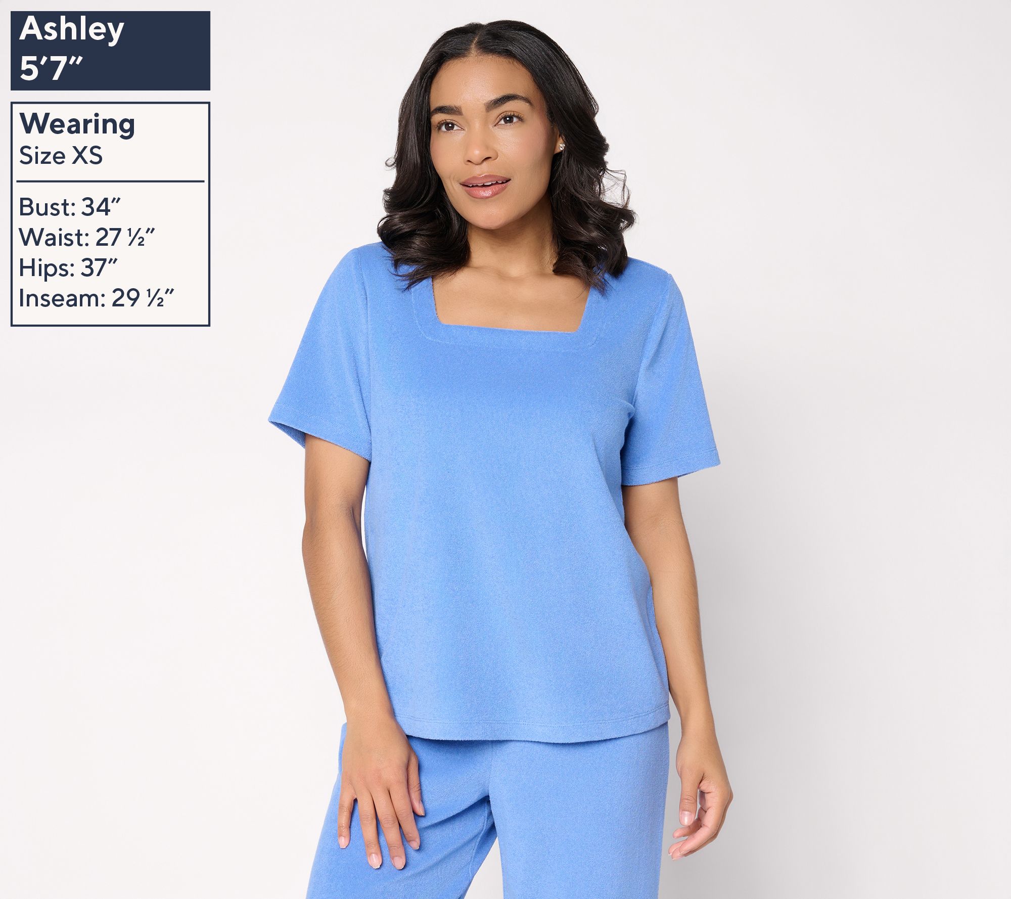 Weekend plans call for a soft terry knit top that pairs effortlessly with your favorite jeans or casual shorts. The square neckline and cap sleeves add a modern touch, making it easy to dress up or down for brunch dates or relaxing afternoons. From Susan Graver.