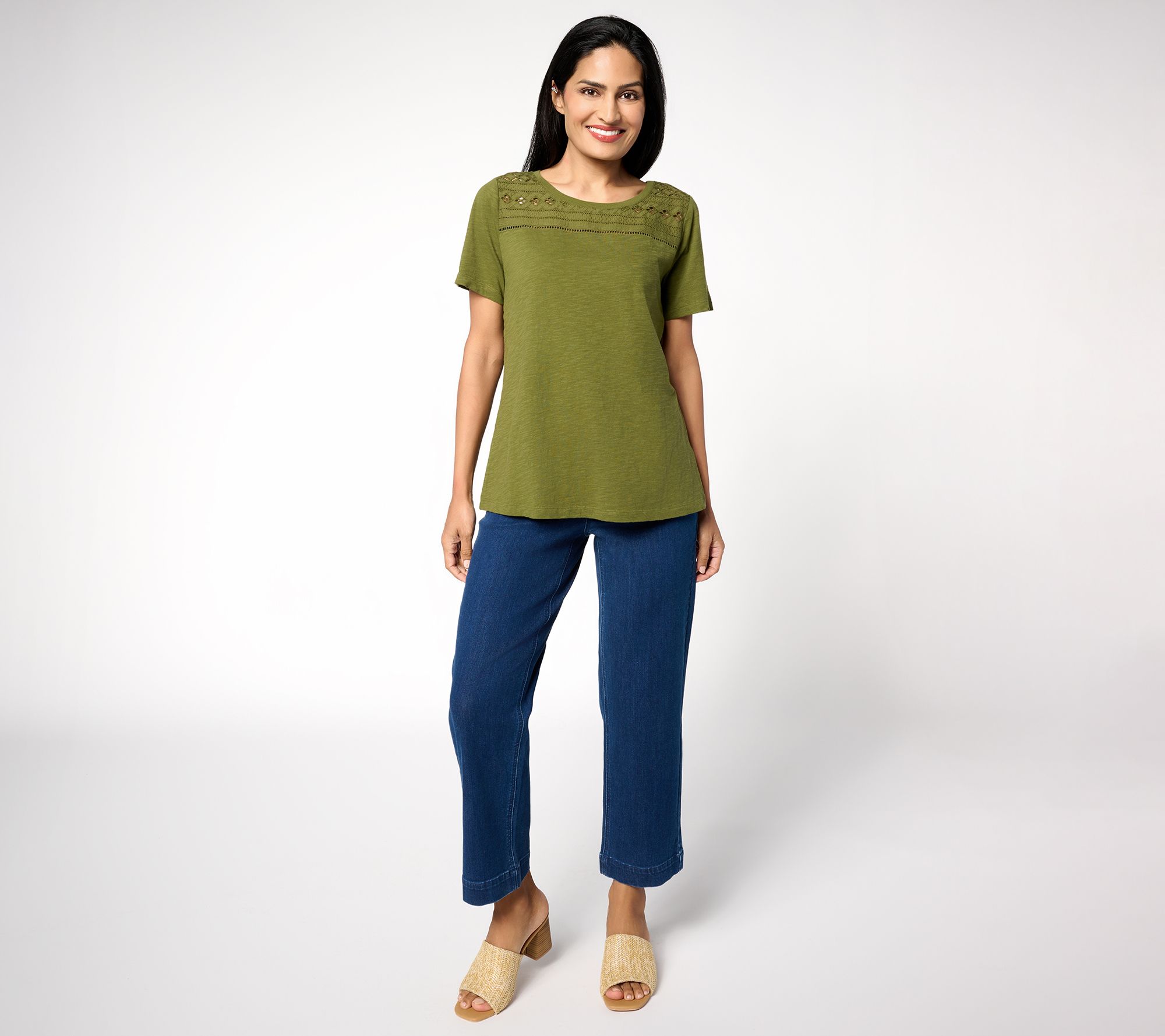 Weekend plans call for a fresh take on comfy style. This textured 100% cotton top, accented with charming eyelet embroidery, is an easygoing pick for running errands, hanging with friends, or relaxing at home. From Susan Graver.