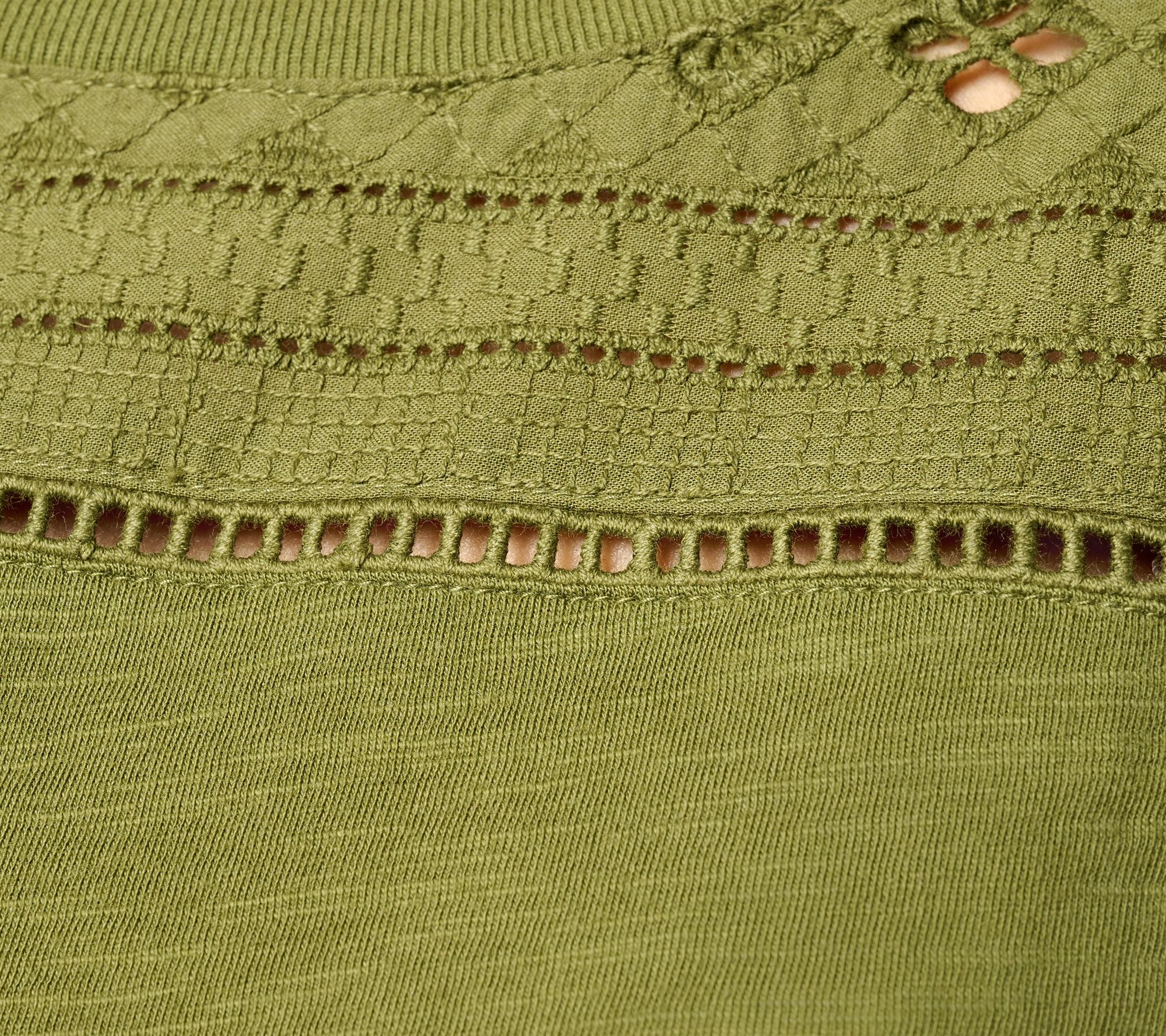 Features: eyelet embroidery on front yoke panel, pullover style, short sleeves, ribbed jewel neckline, straight bottom hem
