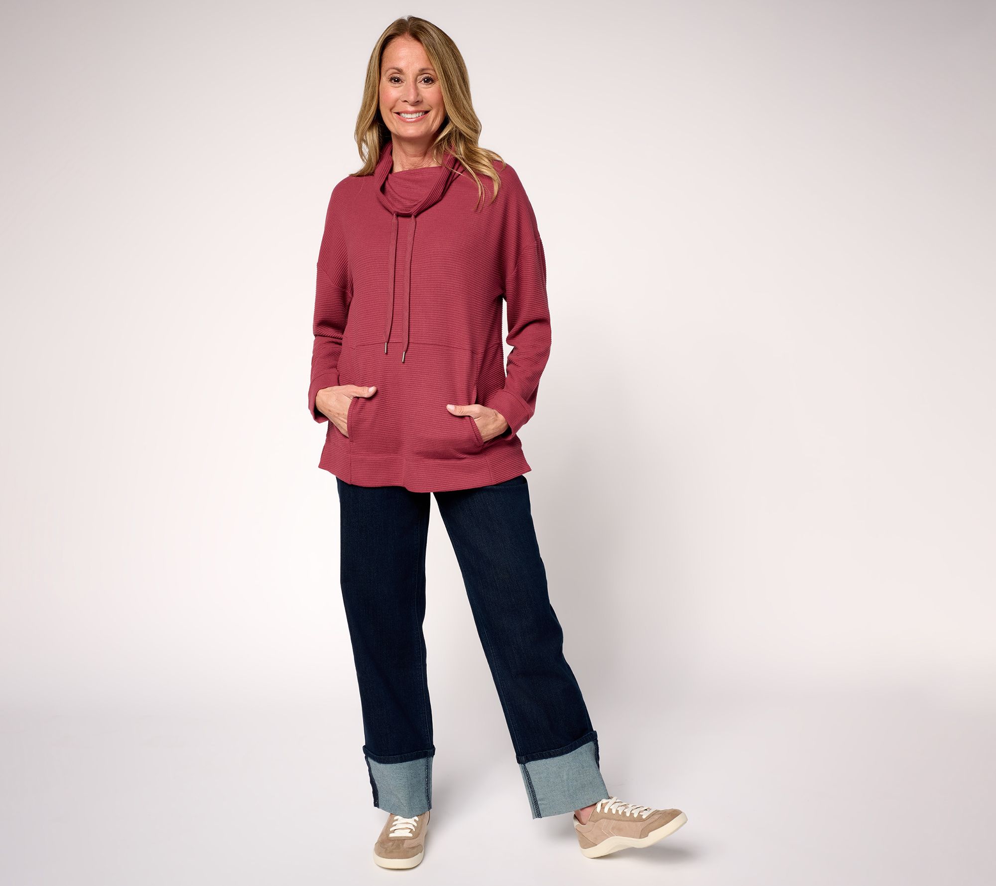 What is it about waffle knit? We can't get enough of this cozy, textured fabric, and neither can Susan Graver. She's created an even cozier idea -- a draped cowl neck top that's as adorable as it is comfortable. Bring it on, chilly mornings and frosty nights! We're ready to take it all on in softness and style, whether headed downtown or for some downtime. From Susan Graver.