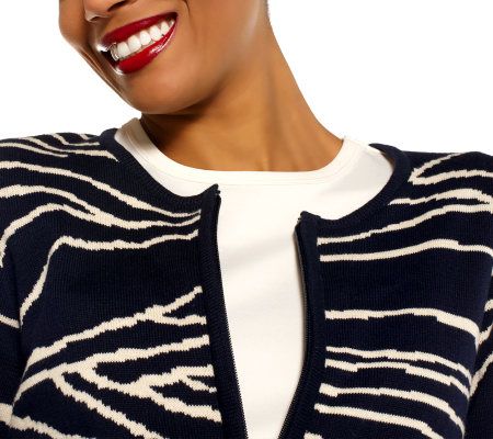 Jewel neckline, zip-front closure, long sleeves, allover print, straight bottom hem