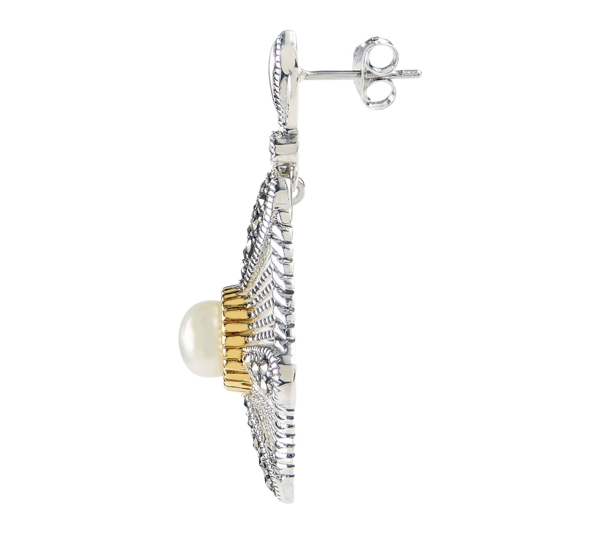 Bring a touch of classic allure to your look with these dangle earrings, gracefully combining white cultured freshwater pearls and sparkling marcasite set in sterling silver and goldtone-finished sterling silver. The elegant contrast and figural detailing make them a striking choice for evenings out or a sophisticated complement at work. From Suspicion Marcasite Jewelry.