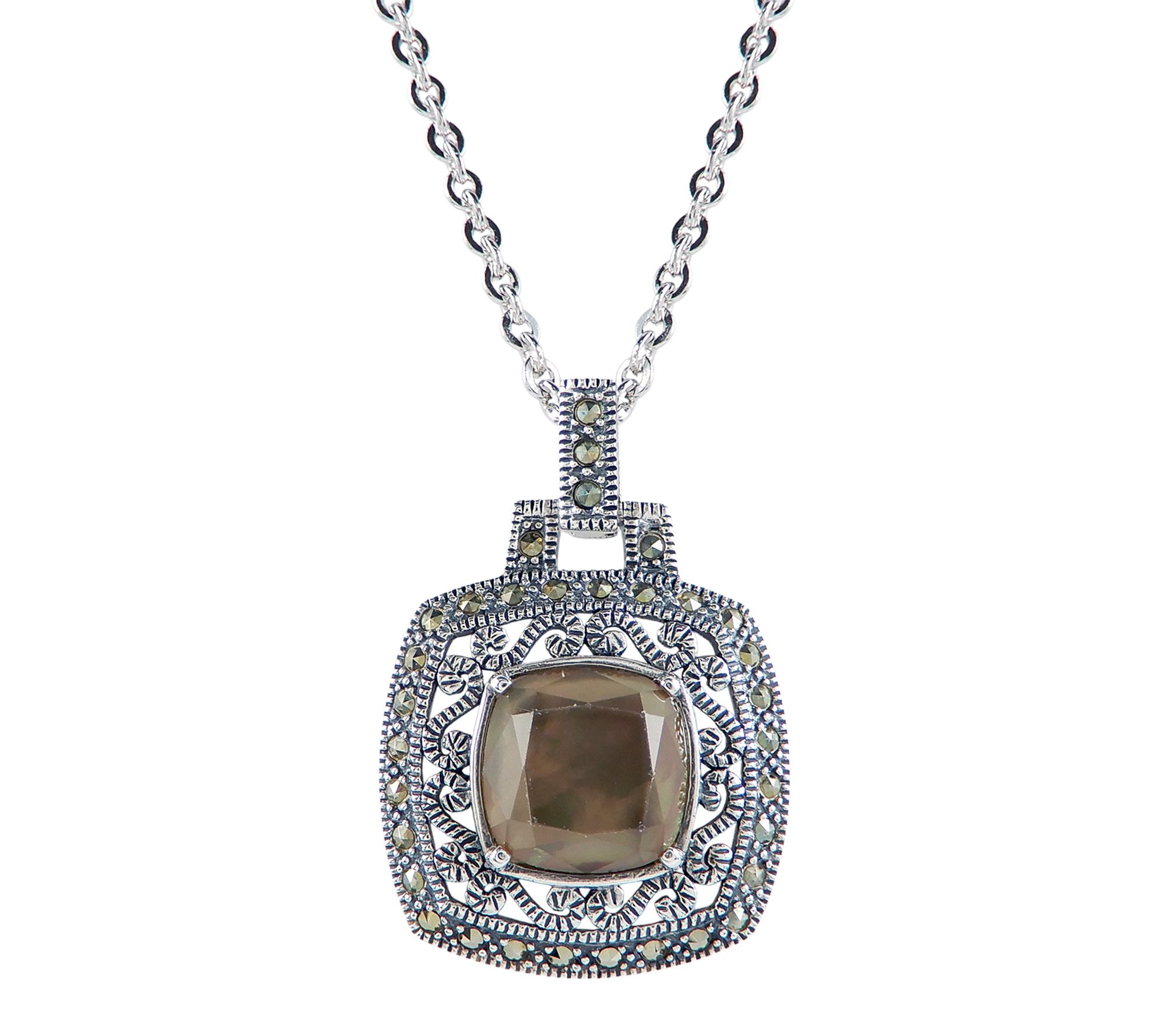 • Cushion-cut doublet and round marcasite gemstones; prong settings; oxidized and highly polished finish; halo-style pendant