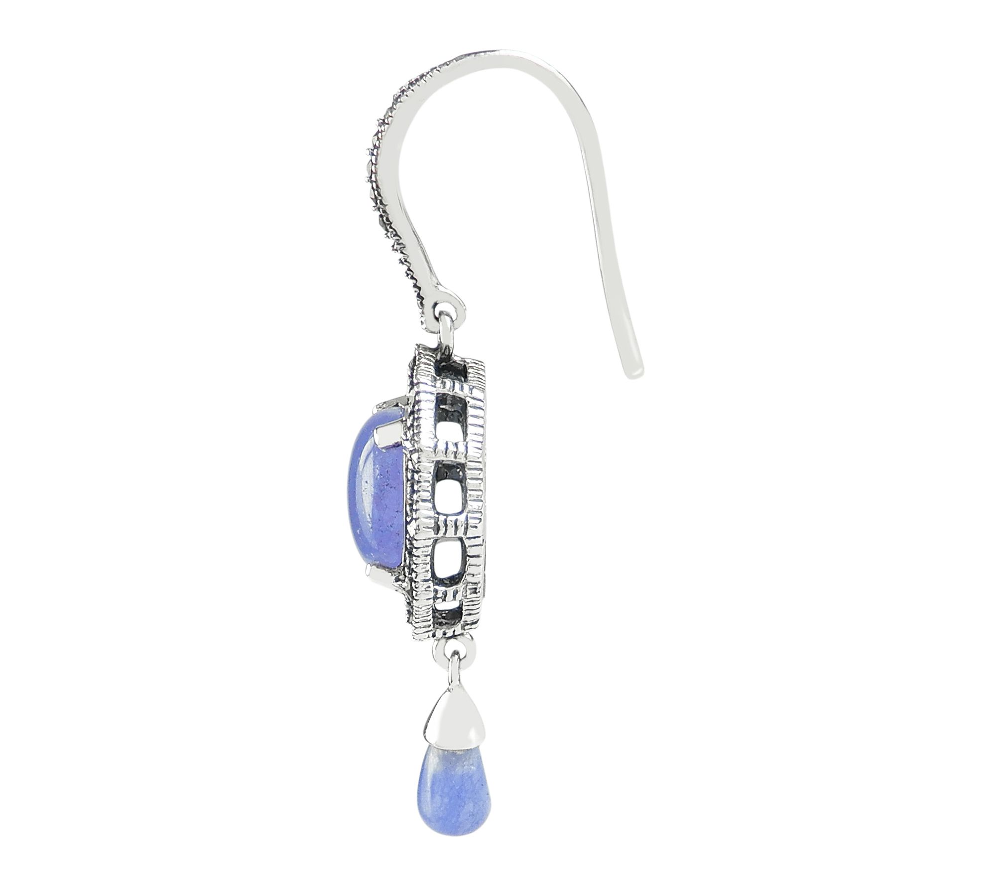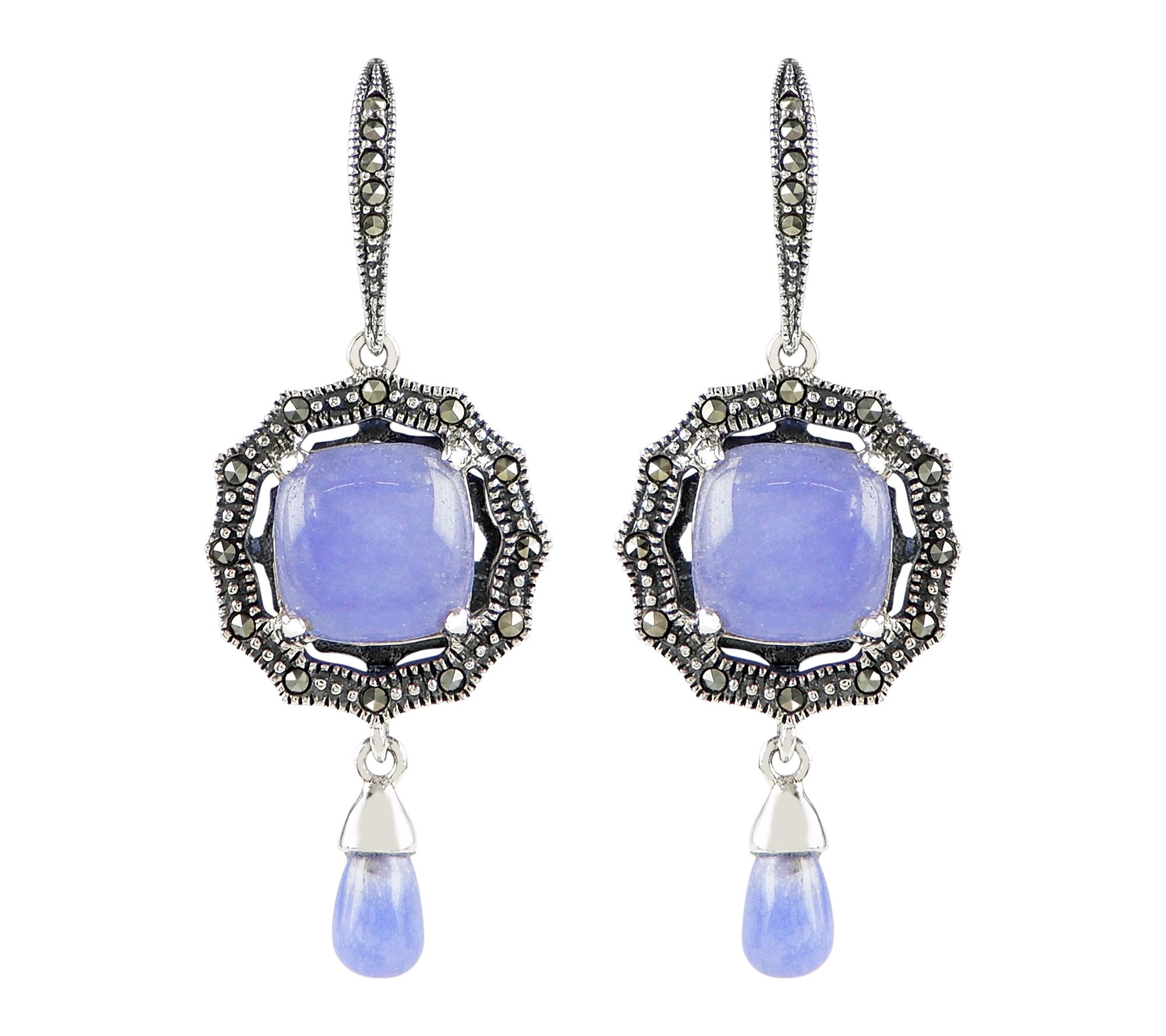 A splash of purple lends striking contrast to the shimmering marcasite accents in these dangle earrings -- making them a bold statement for dinner out or a special celebration. The sterling silver, finished with an oxidized and polished shine, beautifully frames the dyed purple quartz for an elegant touch to any ensemble. From Suspicion® Marcasite Jewelry.