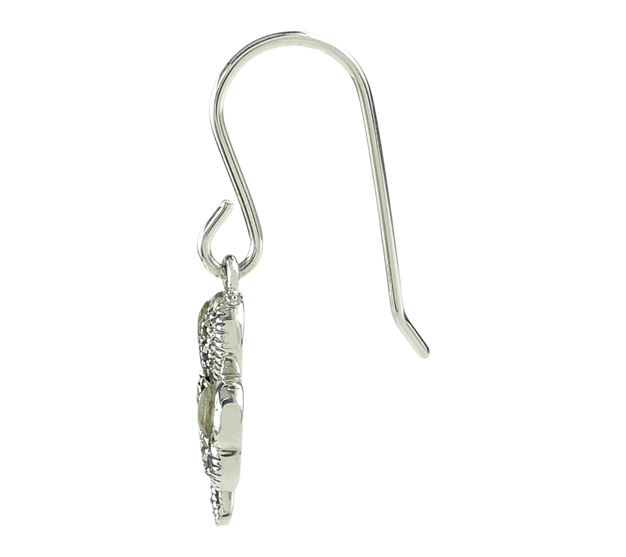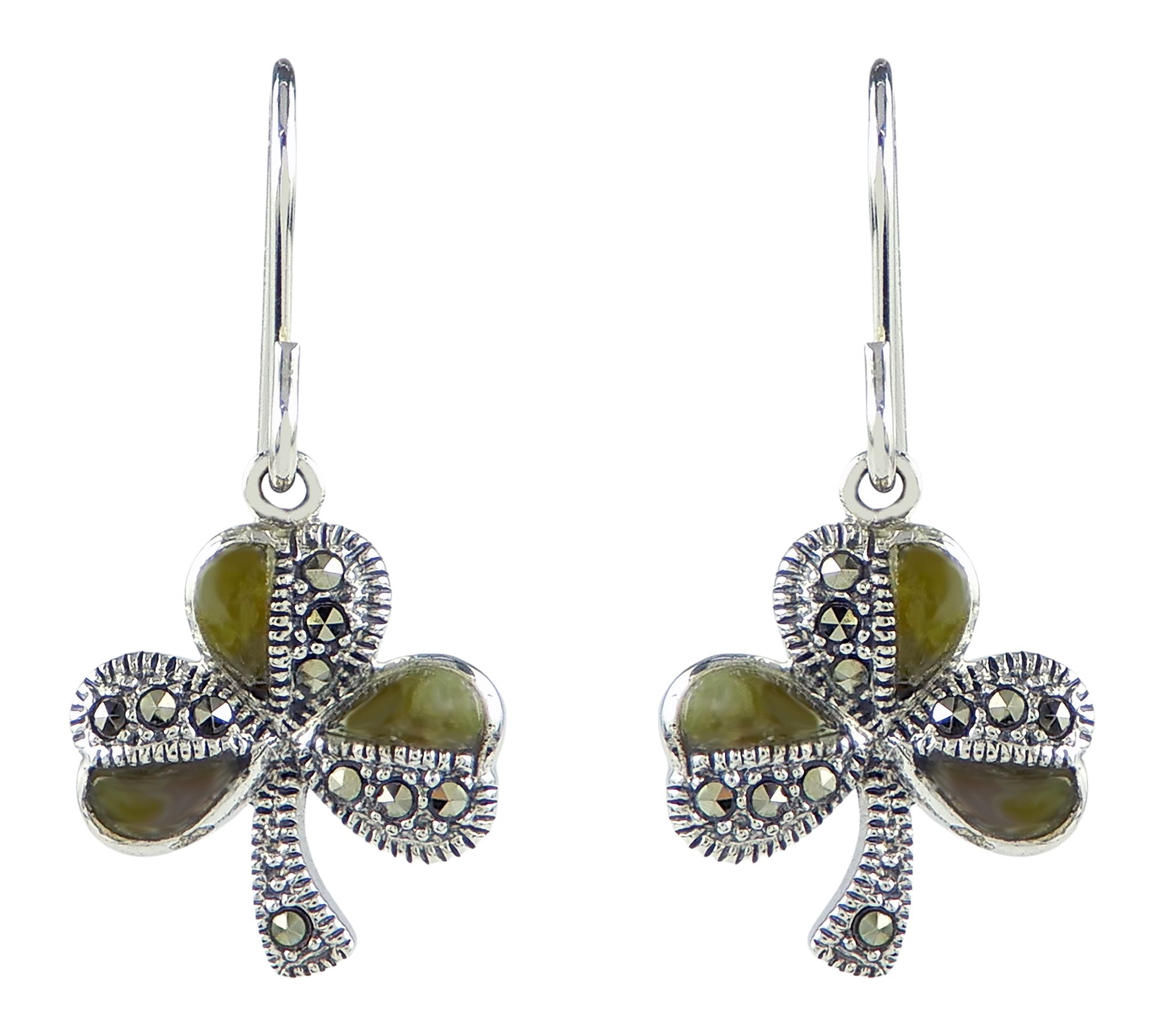 Add whimsical charm to your jewelry collection with these dangle earrings, showcasing a shamrock design set in sterling silver and adorned with genuine green marble and shimmering marcasite accents. Their playful sparkle and polished finish make them a lovely accessory for festive gatherings, St. Patrick's Day celebrations, or everyday style. From Suspicion® Marcasite Jewelry.