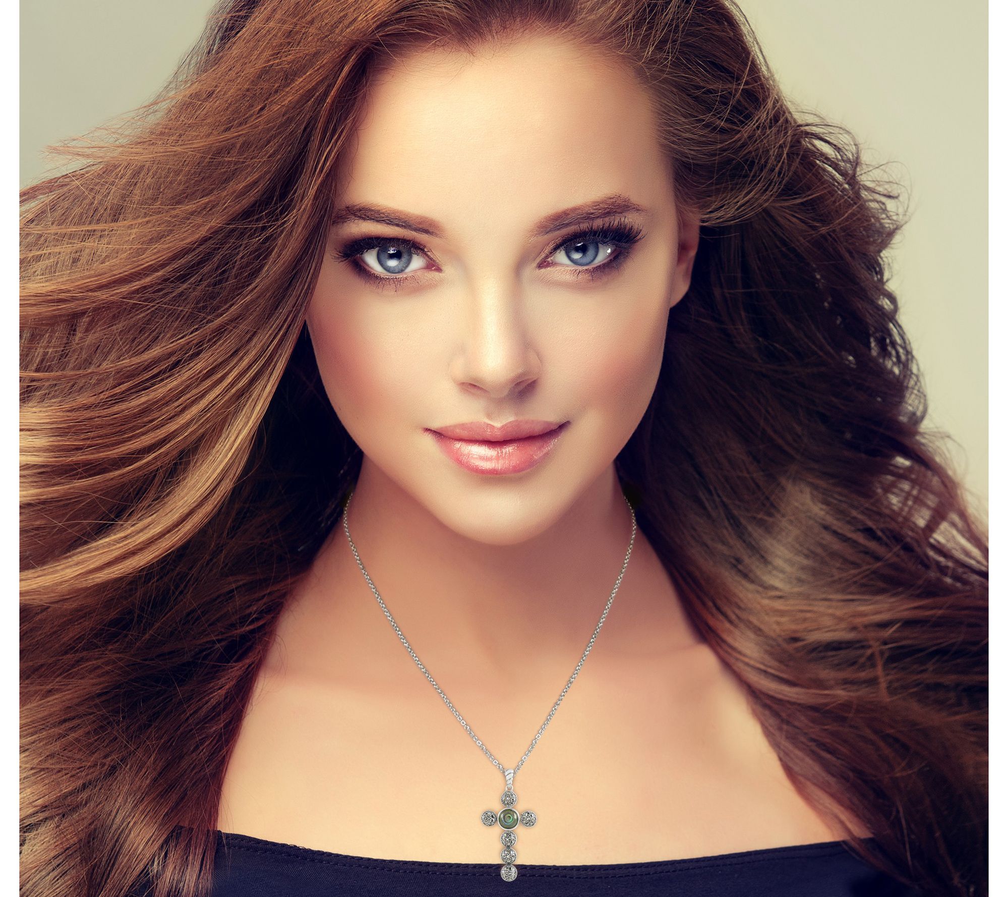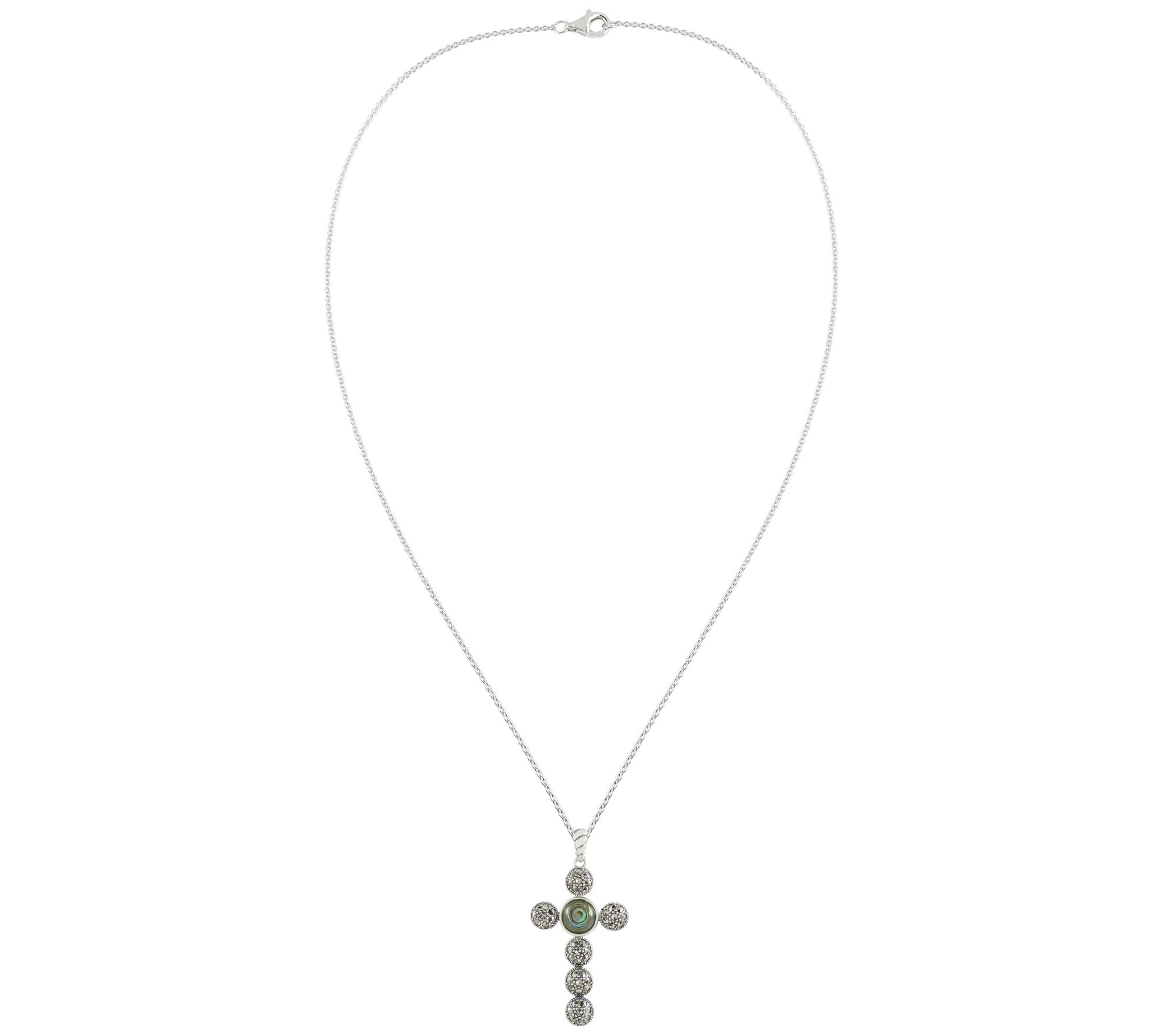 - Cross pendant with bezel-set, round-cut abalone and pave-set, round-cut marcasite; cable chain