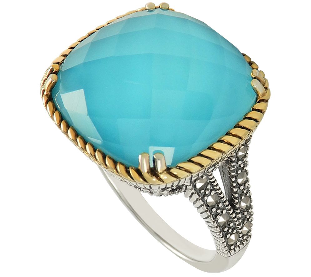 • Four prong-set faceted crystal turquoise doublet outlined by 14K gold-clad sterling silver rope border; marcasite on shank; oxidized finish; polished