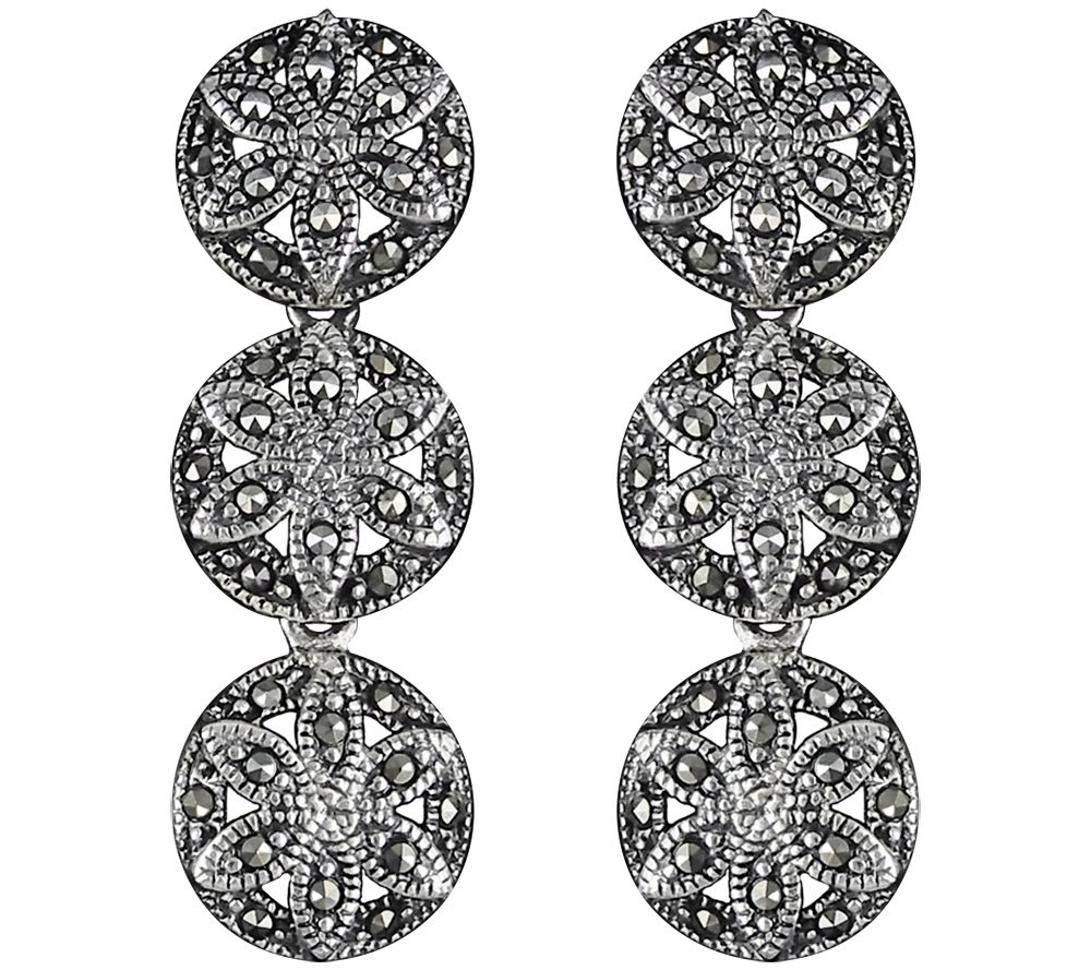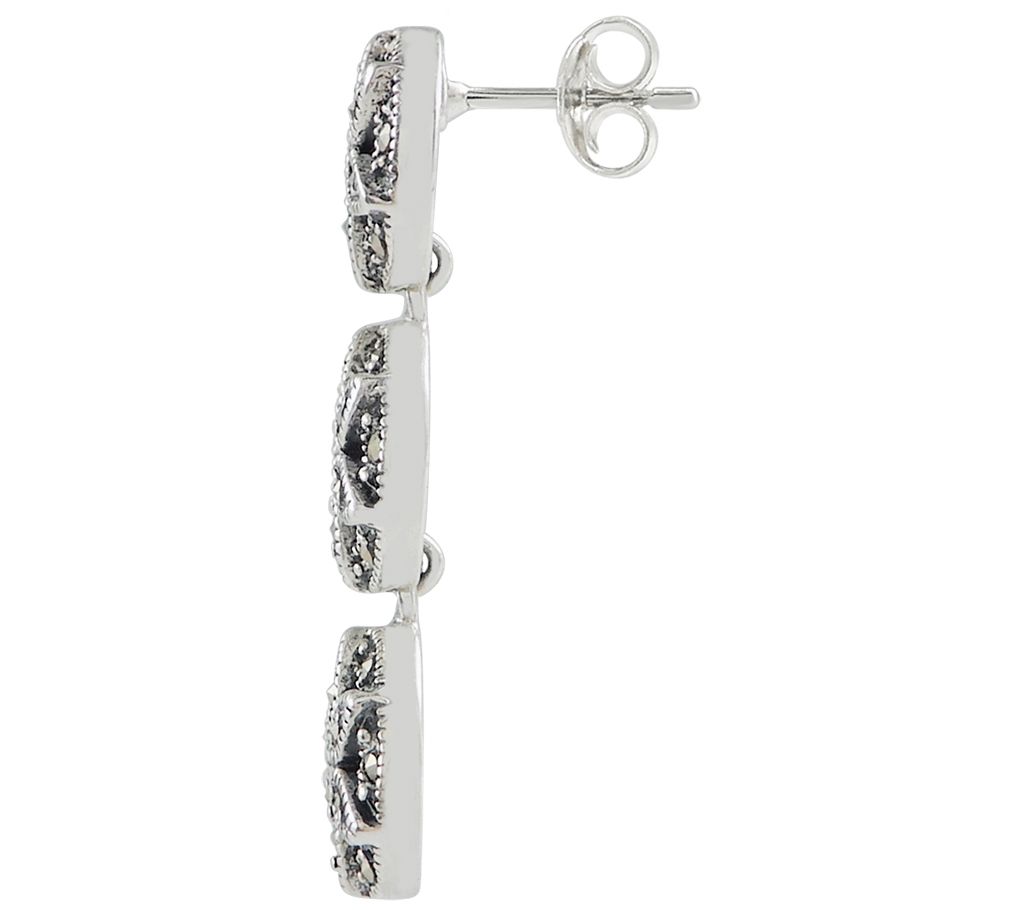 • Dangle floral designs with micropave-set, round marcasite throughout; polished and oxidized finish
