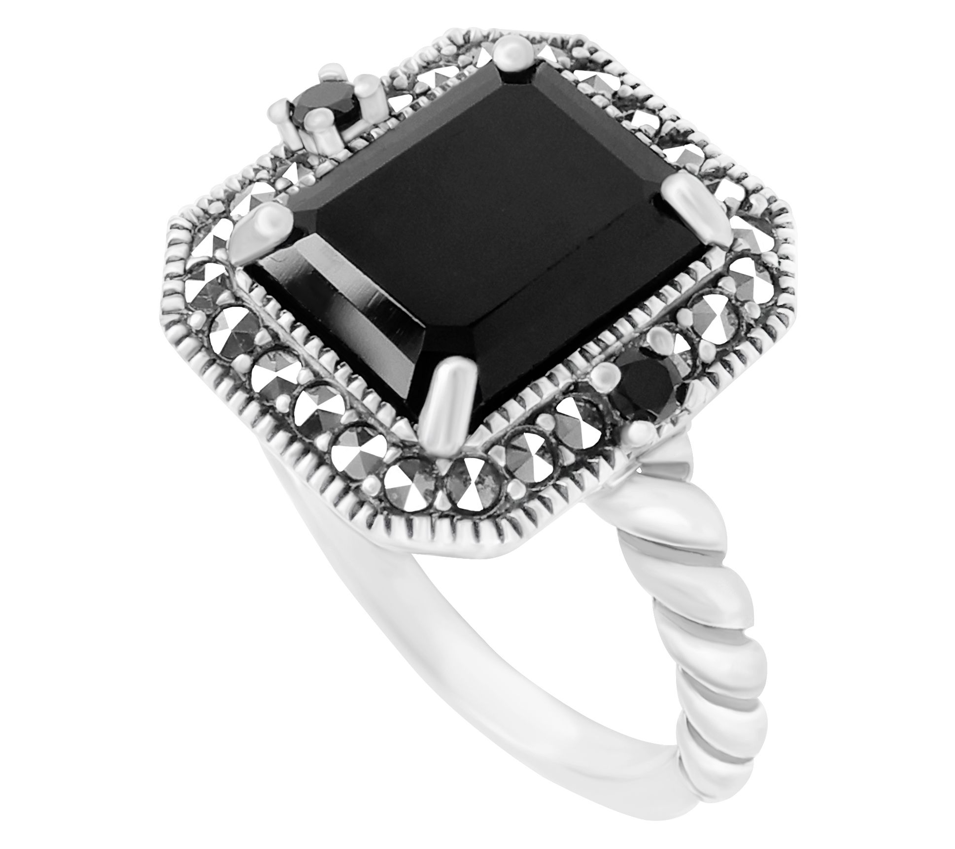 Octagon-cut, prong-set black onyx; round-cut spinel and marcasite gemstones; oxidized finish