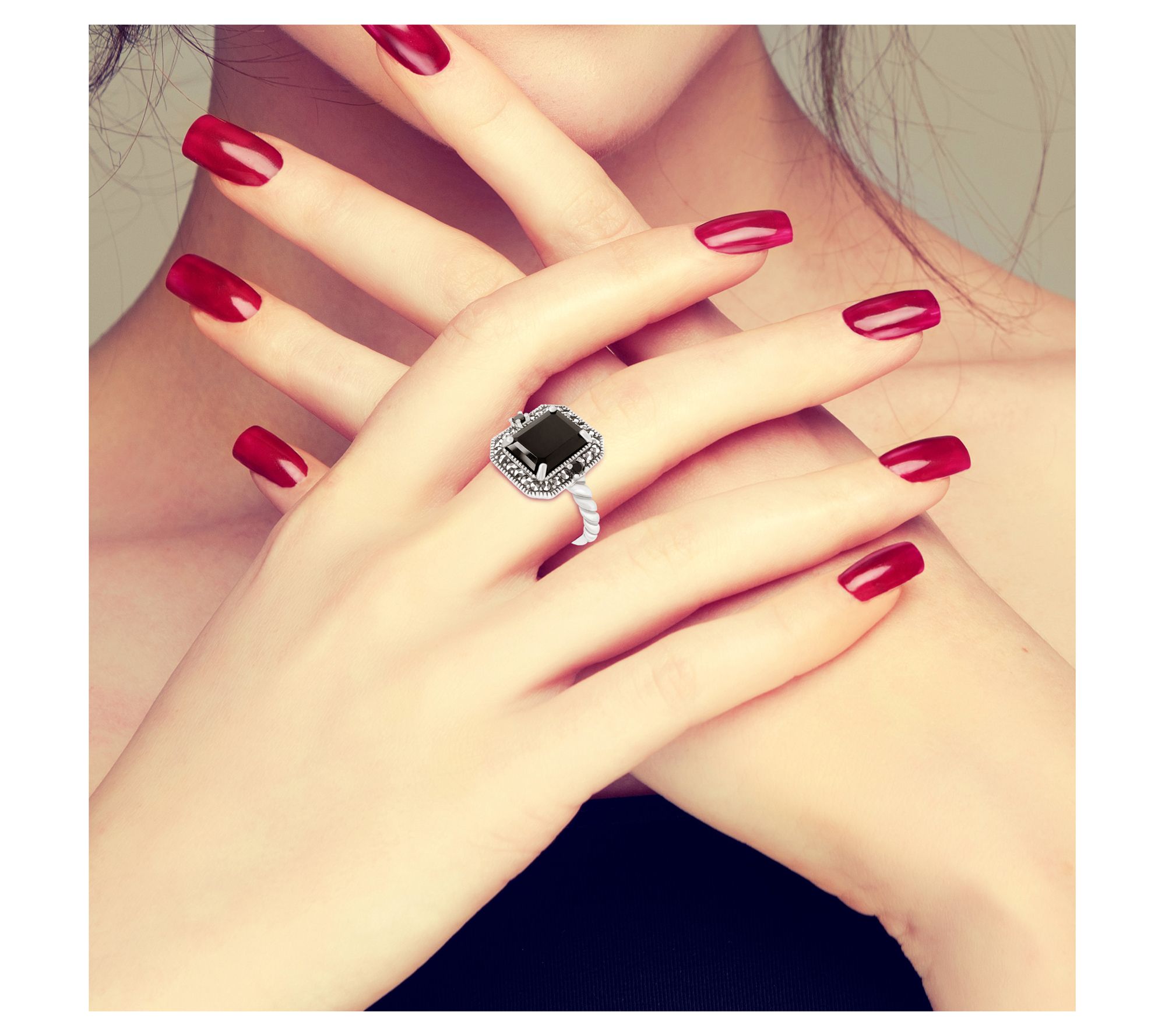 Unleash your boldest self with this striking cocktail ring. Featuring a dazzling combination of onyx, spinel, and marcasite gemstones, this piece stands out with its eye-catching sparkle and luster. From Suspicion.