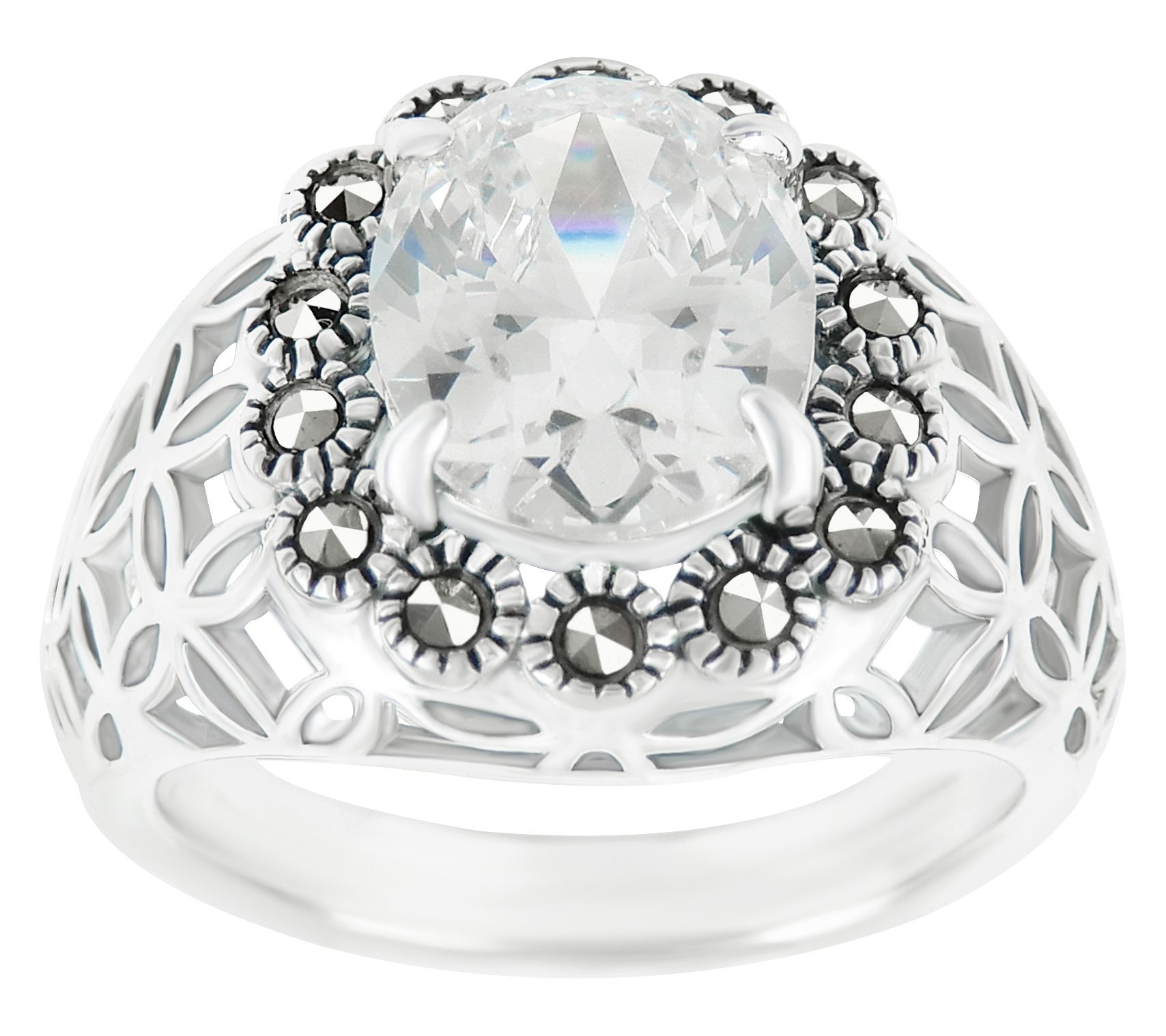 • Domed design; oval-cut, prong-set Diamonique simulated diamond; round, pave-set marcasite gemstones; oxidized; polished finish