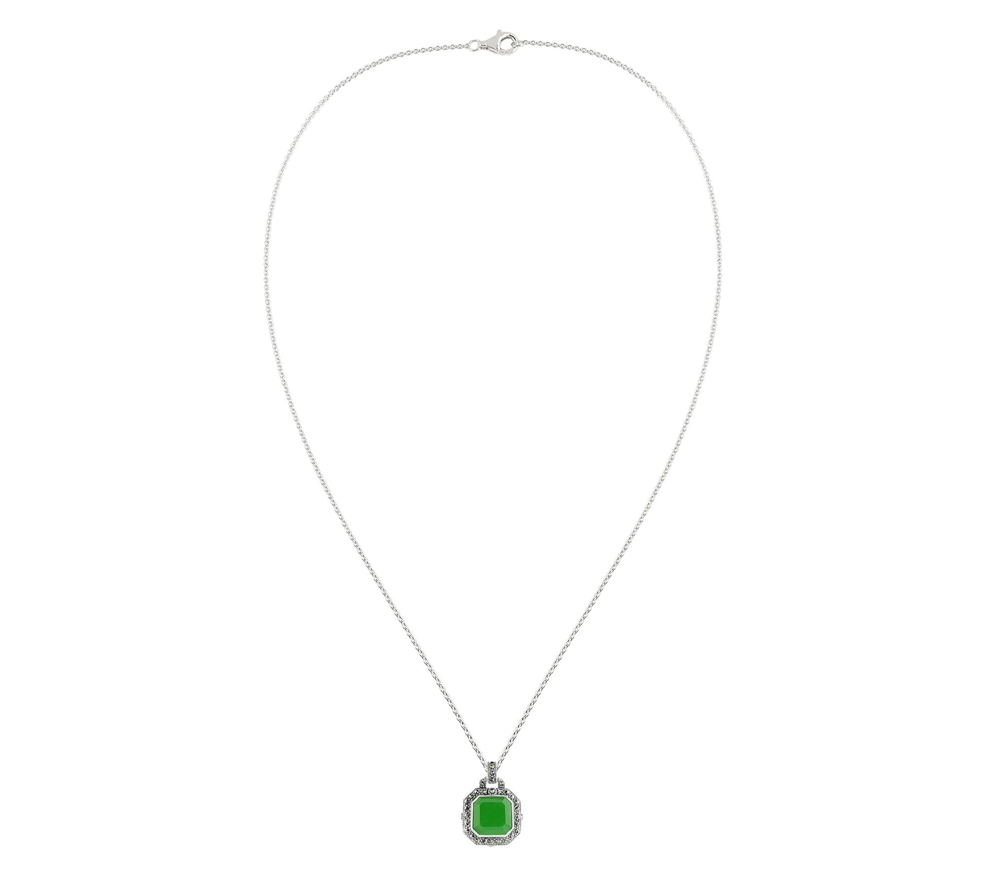 Featuring an octagon-cut dyed green jade and marcasite, this necklace brings a unique charm to any outfit. The added sparkle and luster of these stones, combined with an oxidized finish, make this an ideal accessory for both everyday wear and special occasions. From Suspicion Marcasite Jewelry.