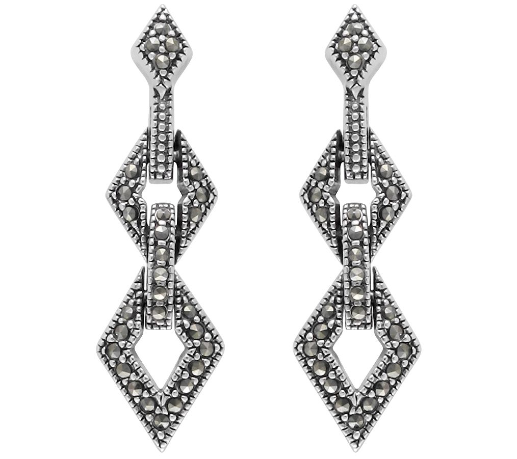 • Open diamond-shaped dangling design; Round prong-set marcasite throughout; polished and oxidized finish