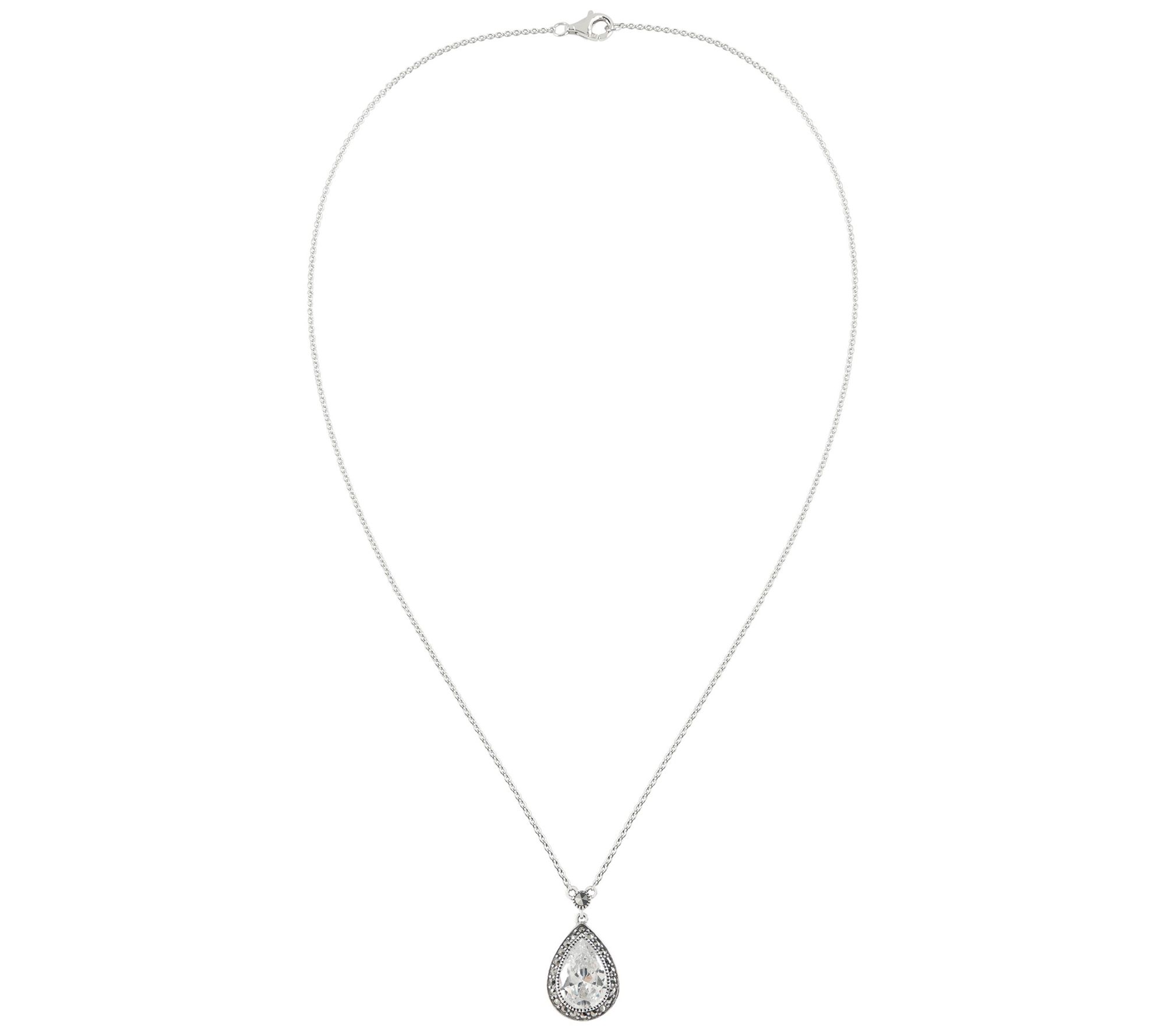 - Bezel-set pear-cut cubic zirconia outlined with pave-set round-cut marcasite; oxidized, highly polished finish