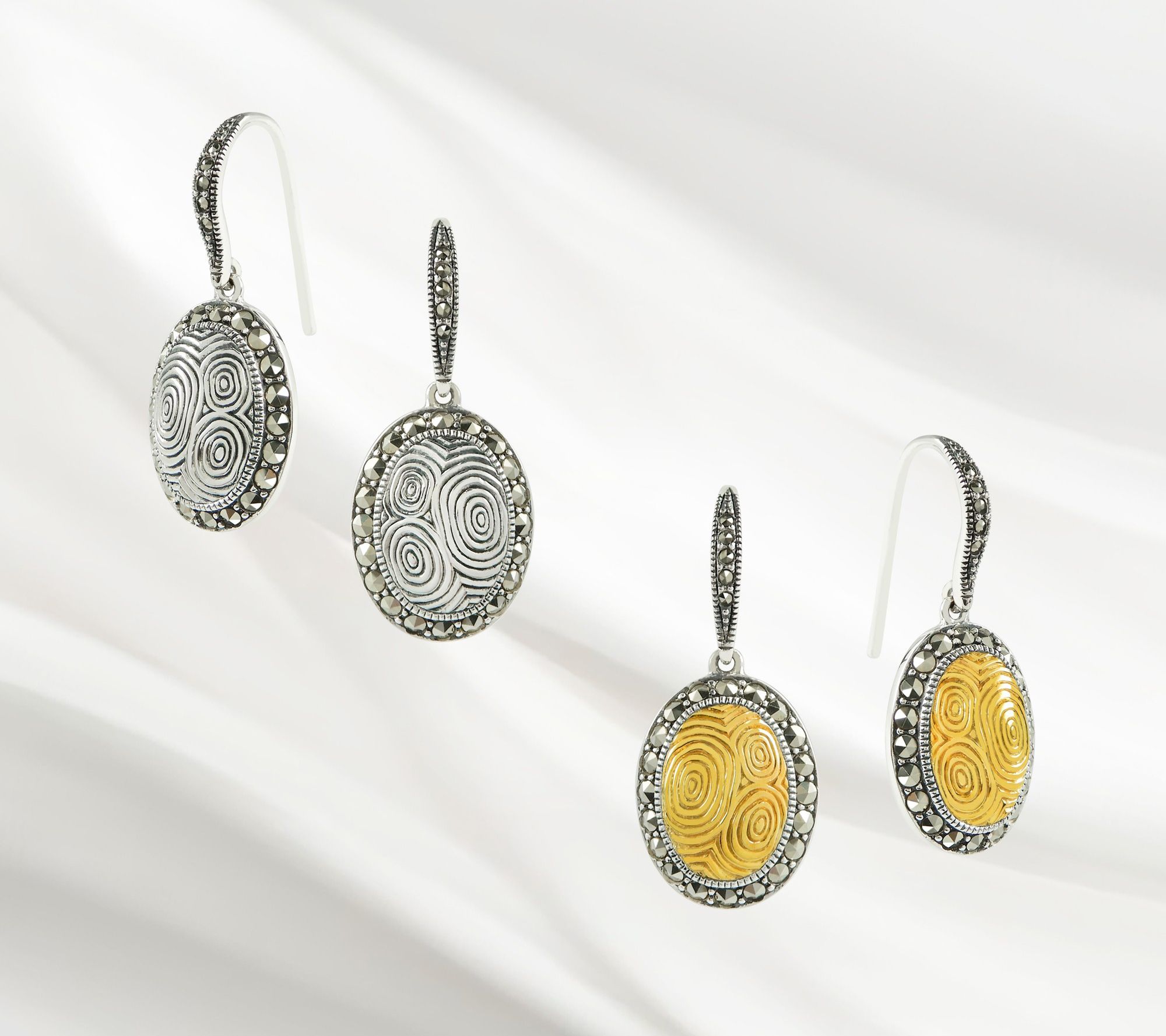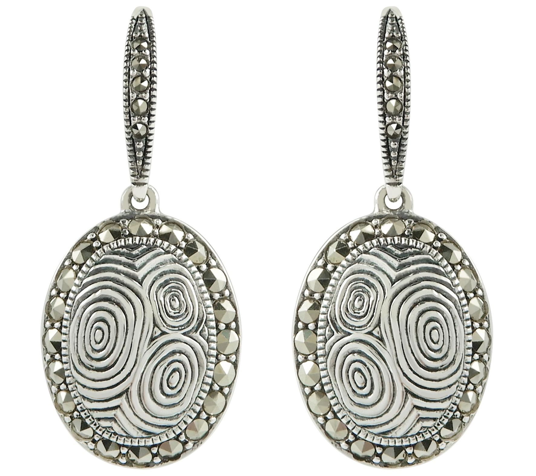 - Dangle earrings with hidden texture and round-cut, pave-set marcasite; oxidized and polished finishes
