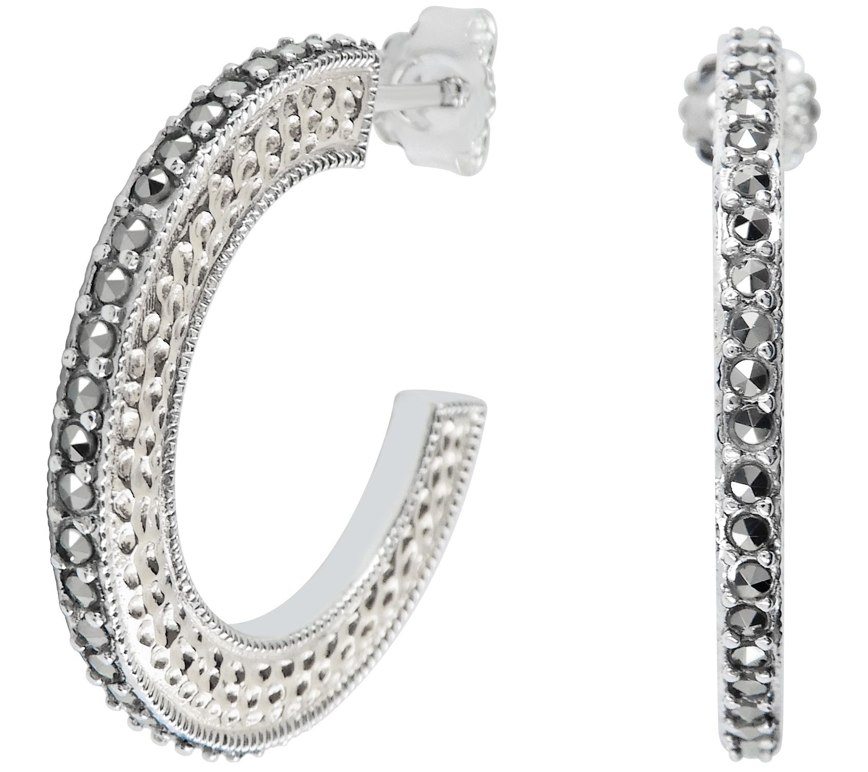 Hoop earrings with round, pave-set marcasite; textured sides; oxidized and high-polished finish