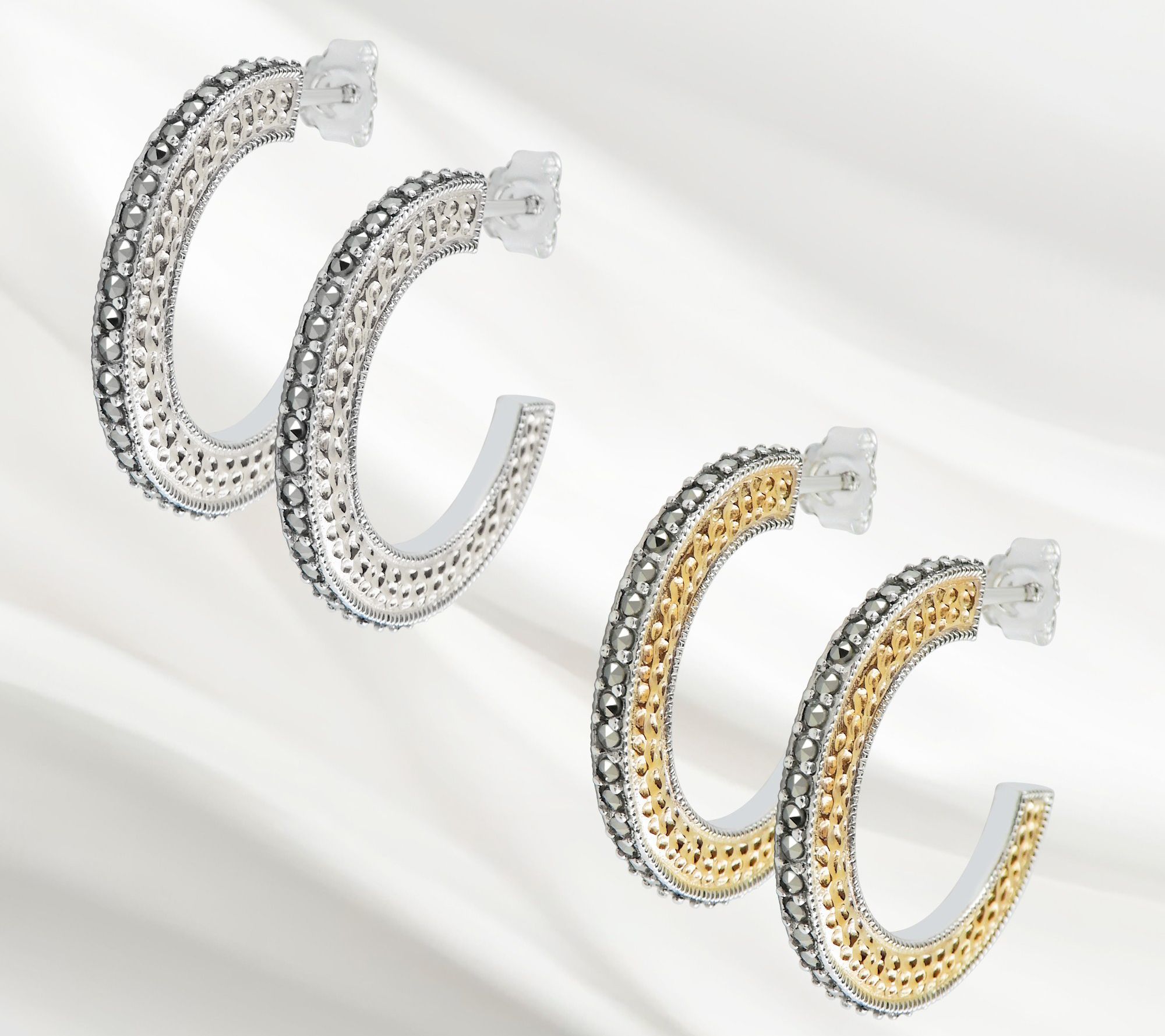 Rich texture, two-toned sterling silver, and shimmering marcasite stones make these hoop earrings perfect for adding polish to anything from a casual outfit to a little black dress. From Suspicion® Marcasite Jewelry.