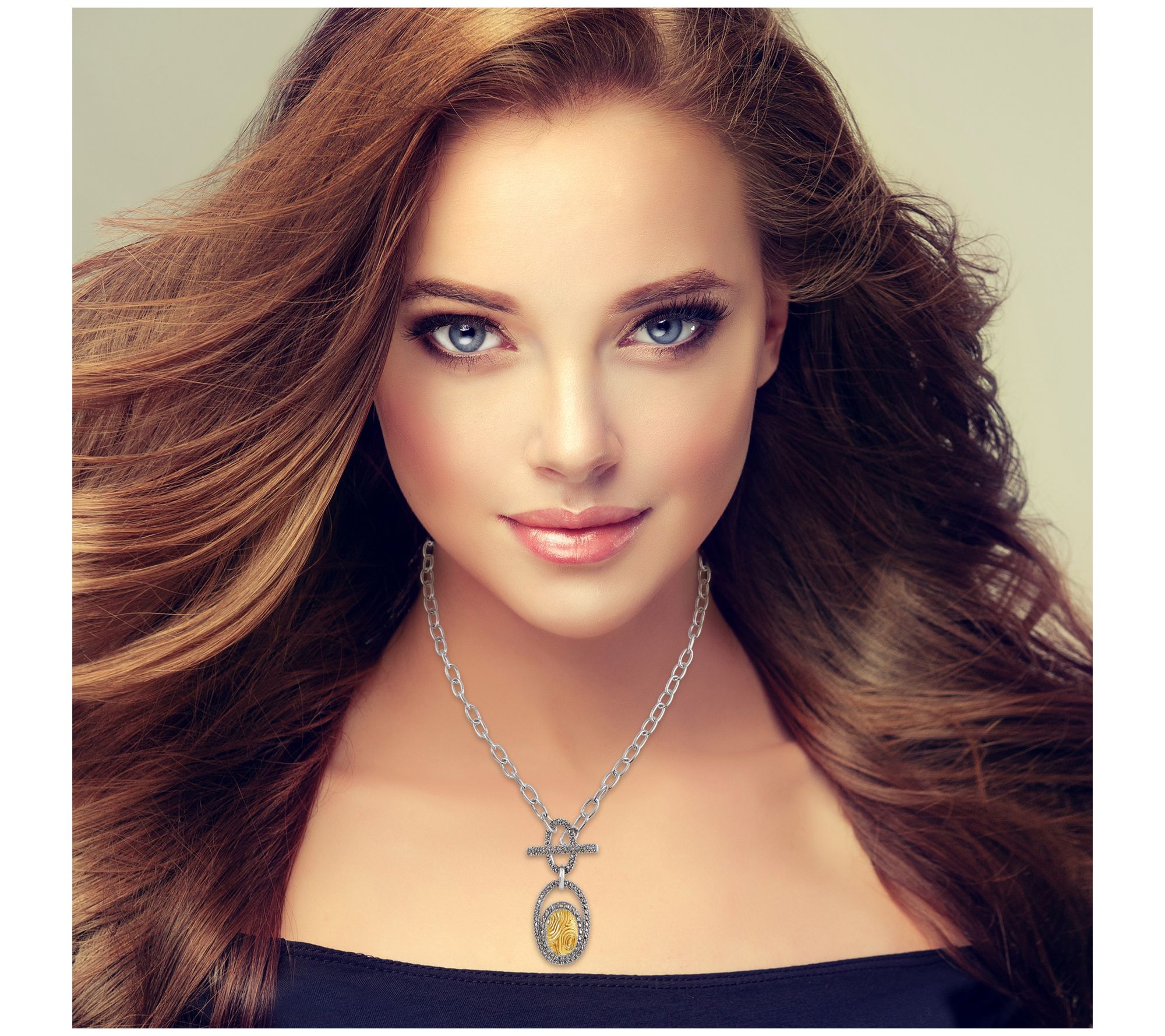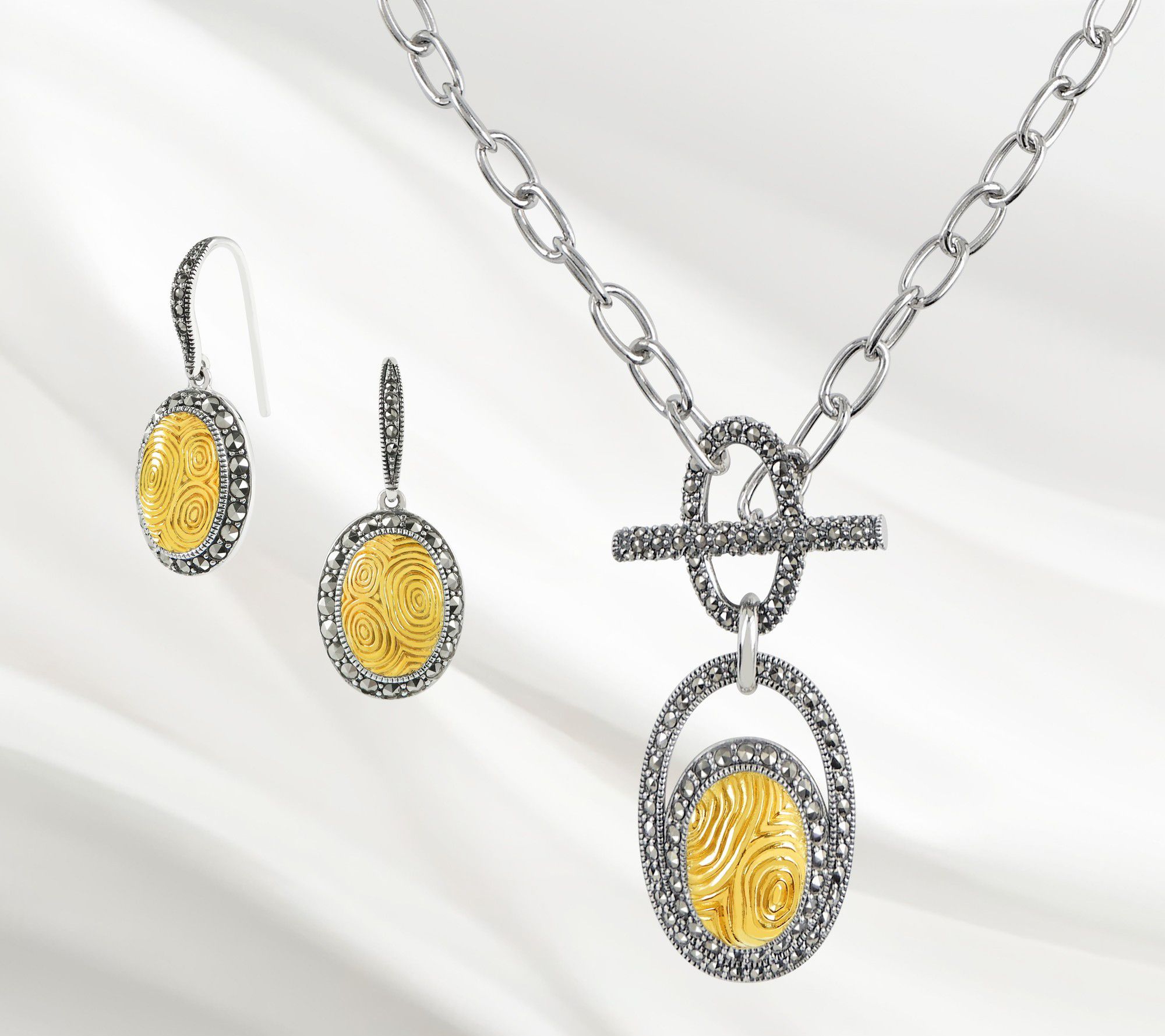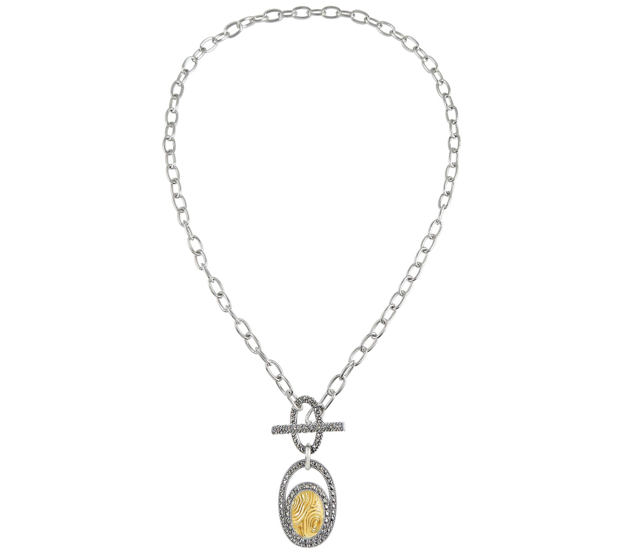 - Pave-set round-cut marcasite; cable link chain; oxidized, highly polished finish