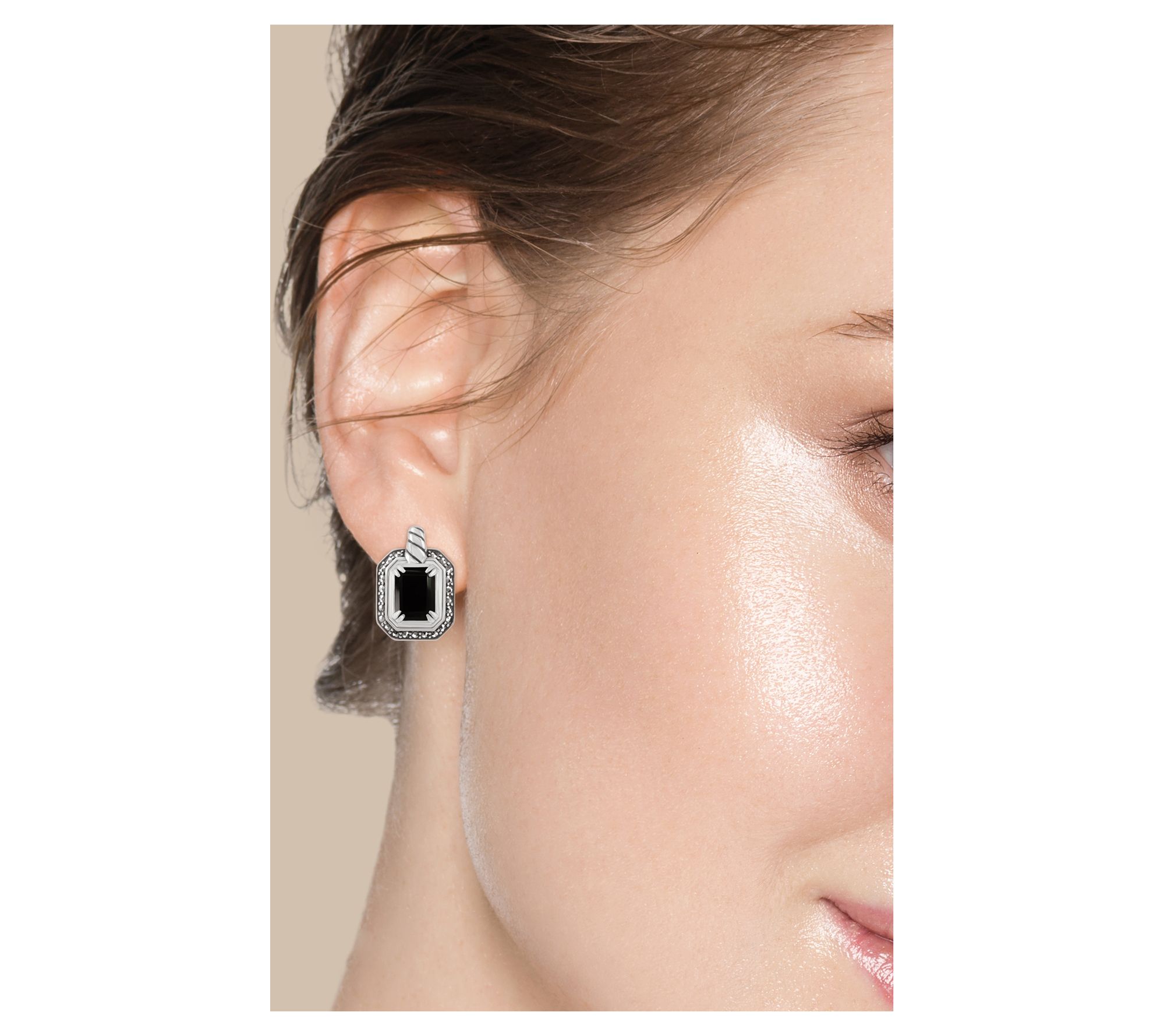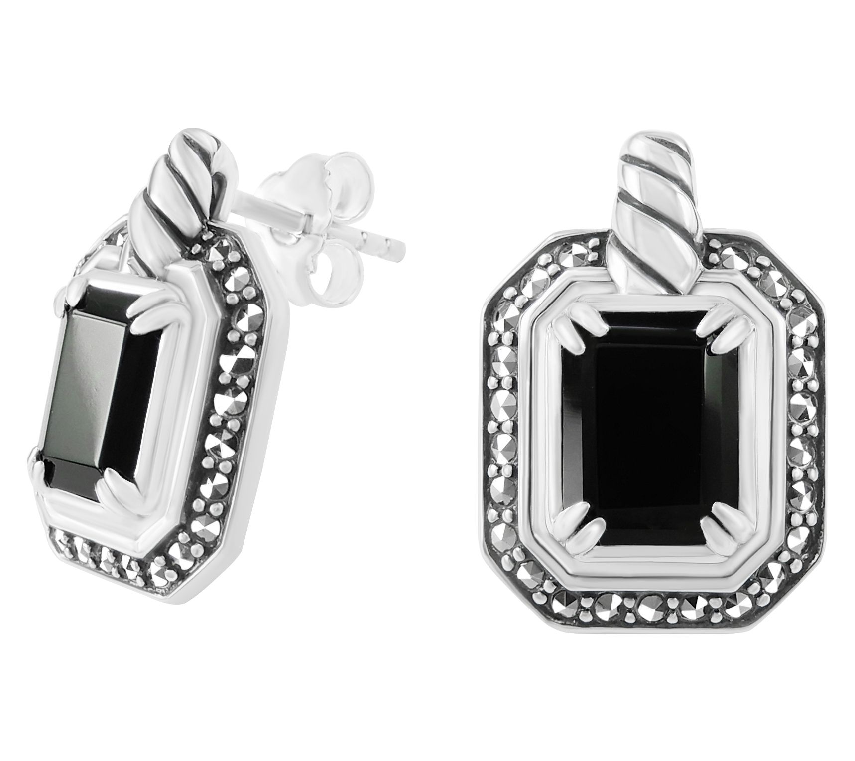 - Black onyx and marcasite; prong and pave settings; polished and oxidized finish