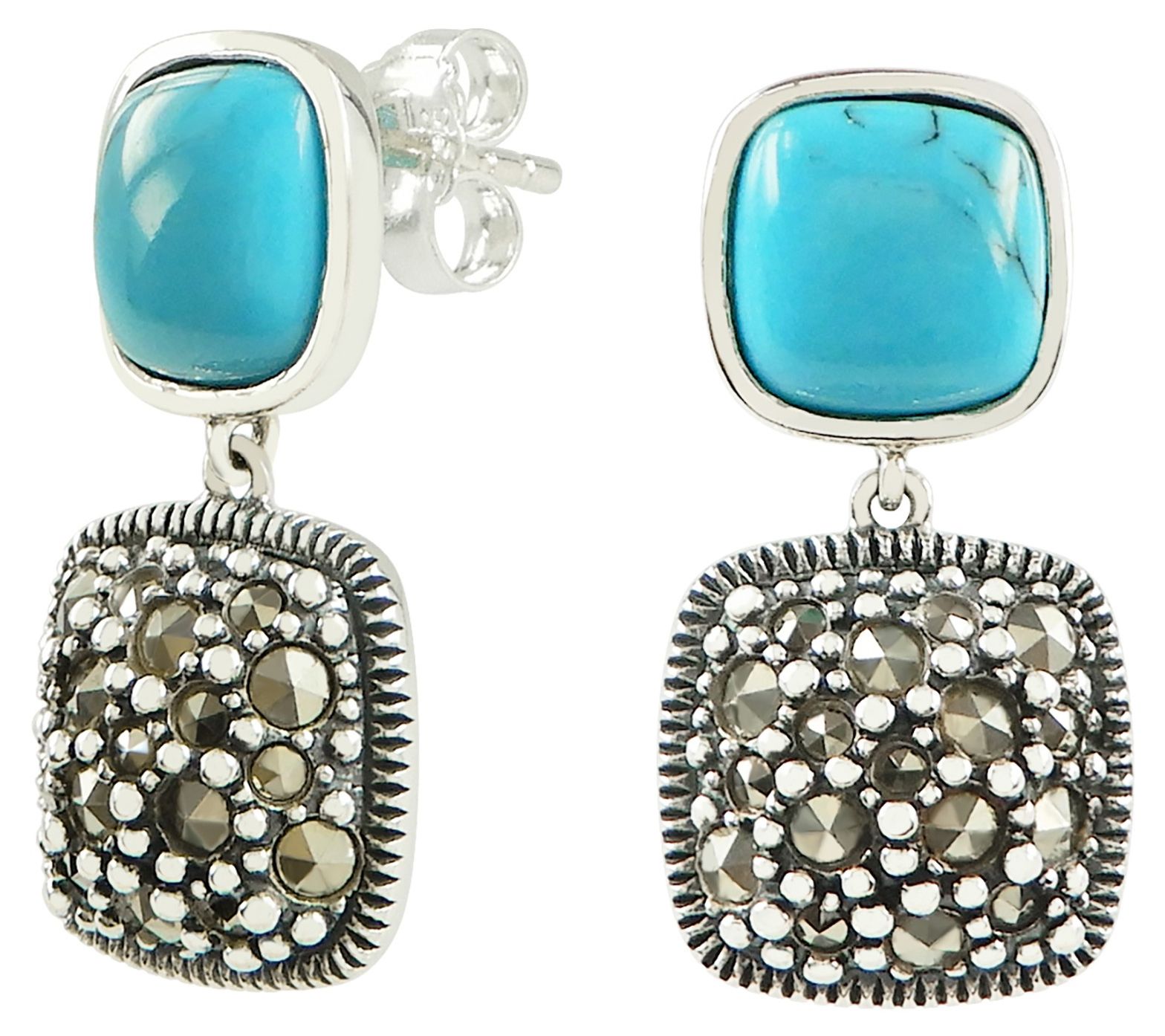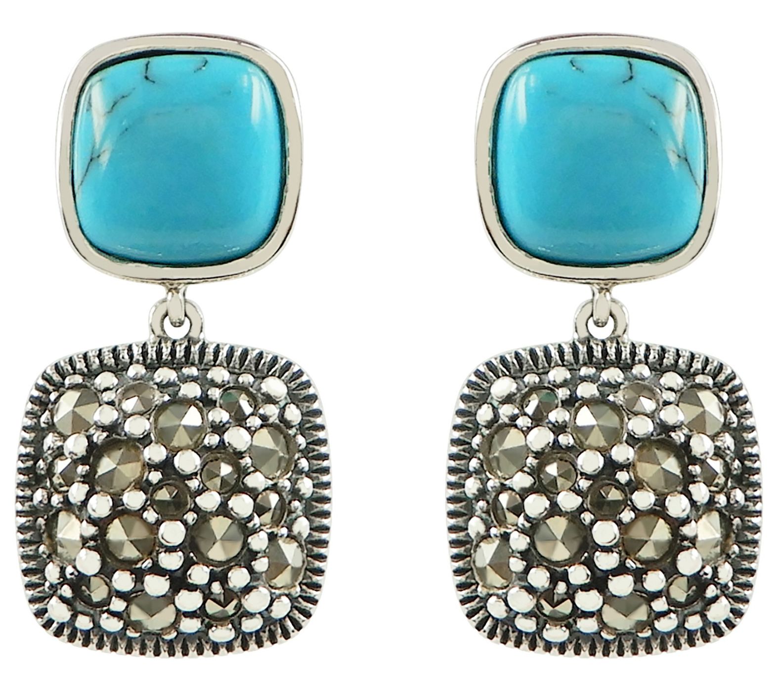 - Bezel-set cushion-cut simulated turquoise; pave-set round-cut marcasite; oxidized and highly polished finish