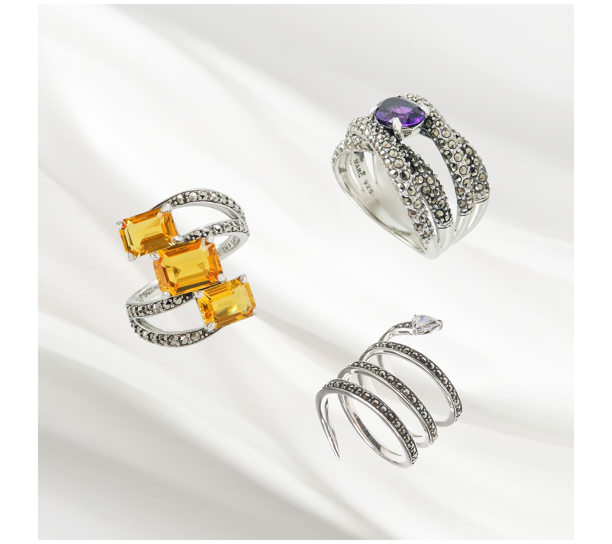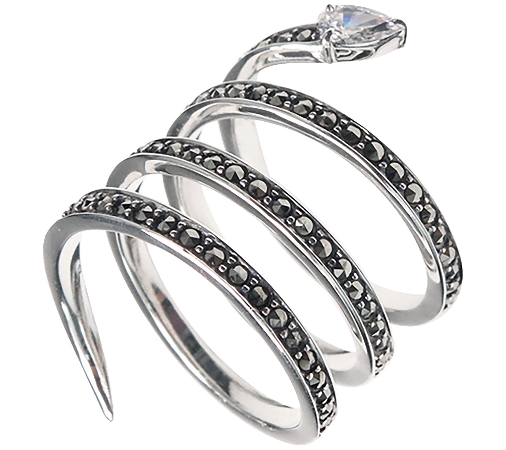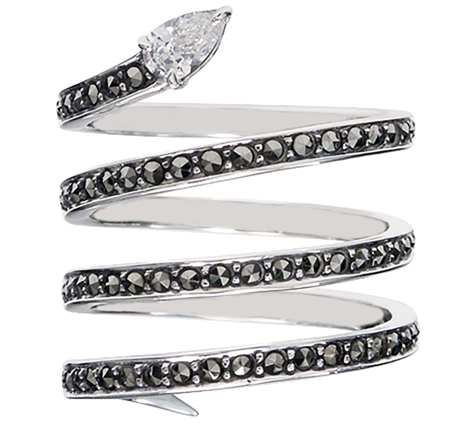 Enrich your outfit with the dark sparkle of this statement-making ring set with a scintillating cubic zirconia stone at the top and marcasite gems throughout. From Suspicion.
