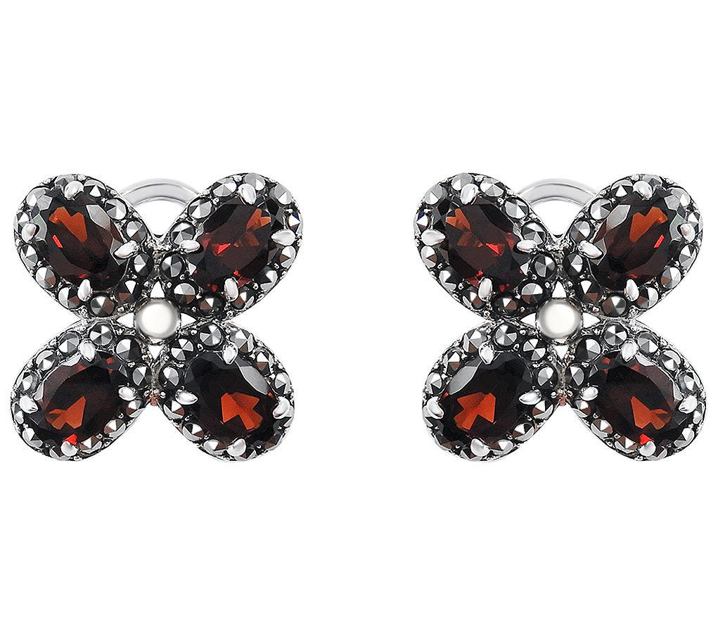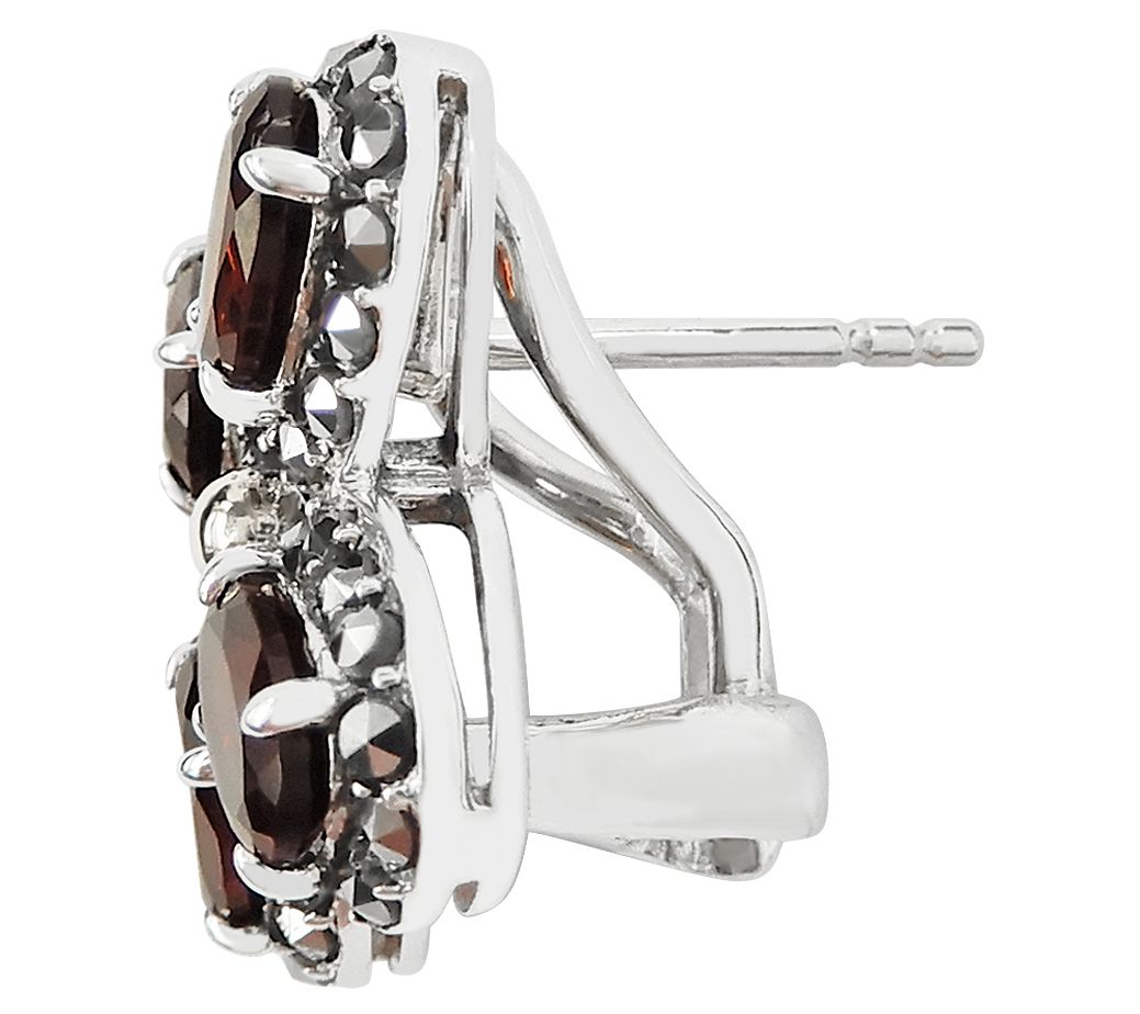 - Prong-set, oval-cut simulated garnets accented with prong set, round-cut marcasite throughout; polished and oxidized finish