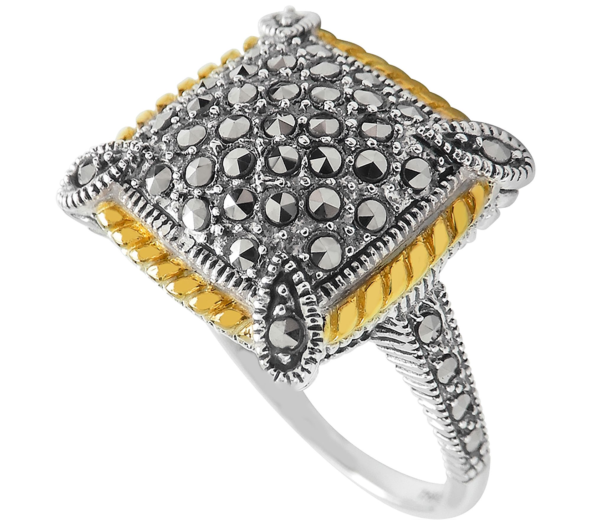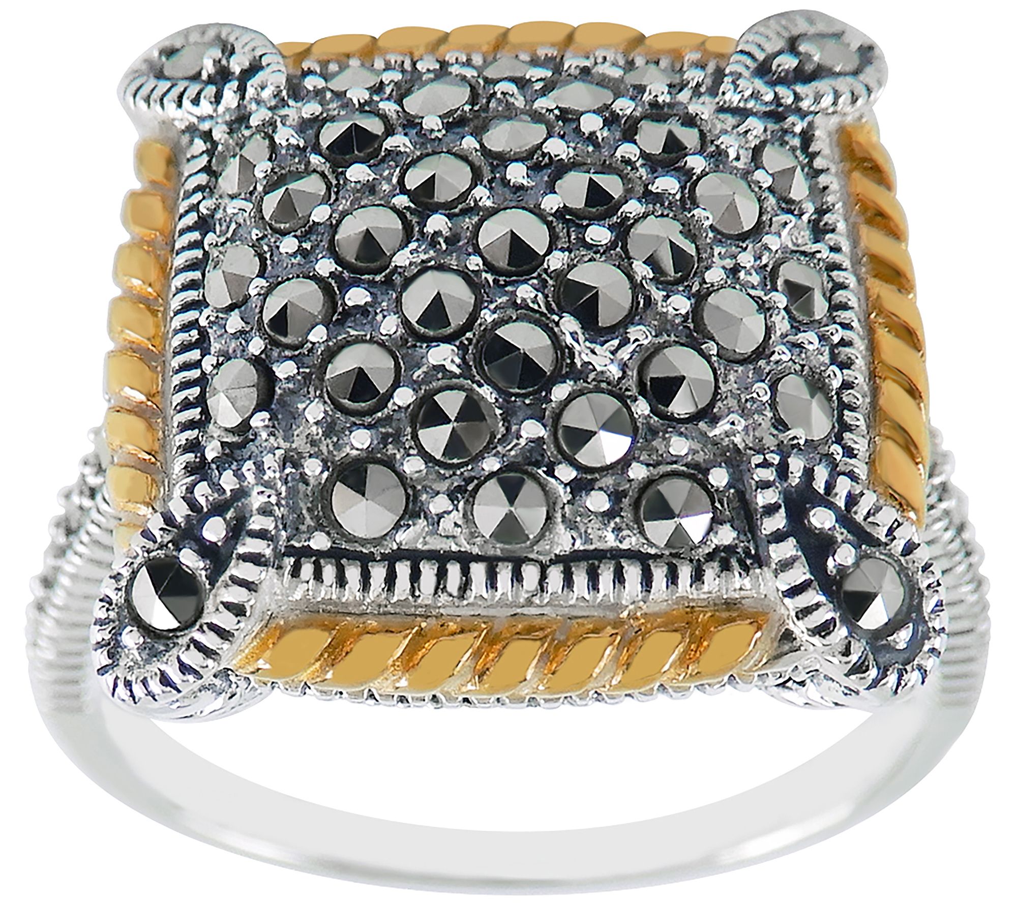 Offering unique style and plenty of shimmer, this fun ring showcases marcasite set in a square shape and surrounded by a 14K yellow gold-clad rope design. From Suspicion® Marcasite Jewelry.