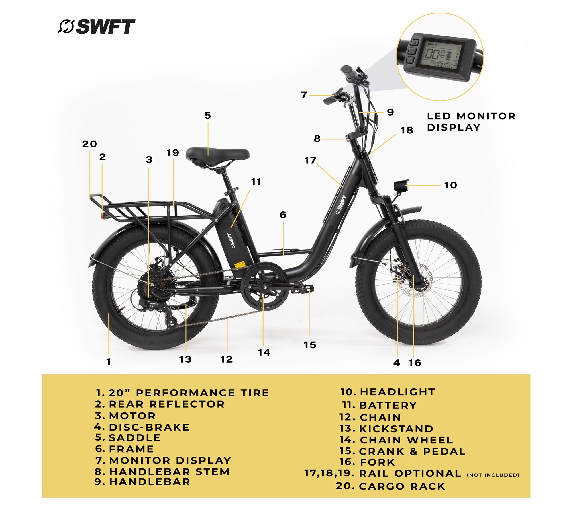 Let the journey begin. With the SWFT V.X electric bike, travel from here to there to anywhere in sleek and speedy style. Boasting a maximum speed of 20mph, the step-through design includes a 500W motor, three pedal assist modes, and throttle control when you need a little extra oomph. Plus, a built-in LCD display indicates your battery levels and speed at a quick glance. From SWFT.