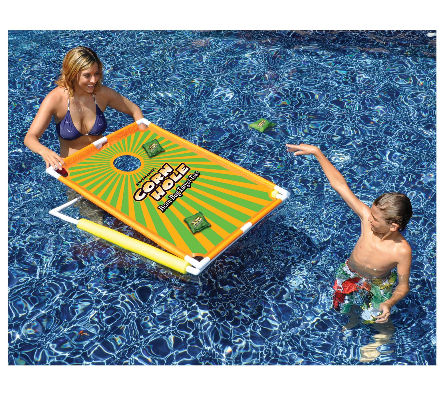 Bring the fun of cornhole to the water with this floating bean bag target toss game. Perfect for pool parties or indoor play, this game includes a baggo pad and eight color-coded bean bags for competitive play. From Swim Central.