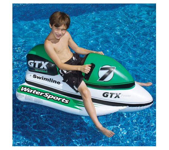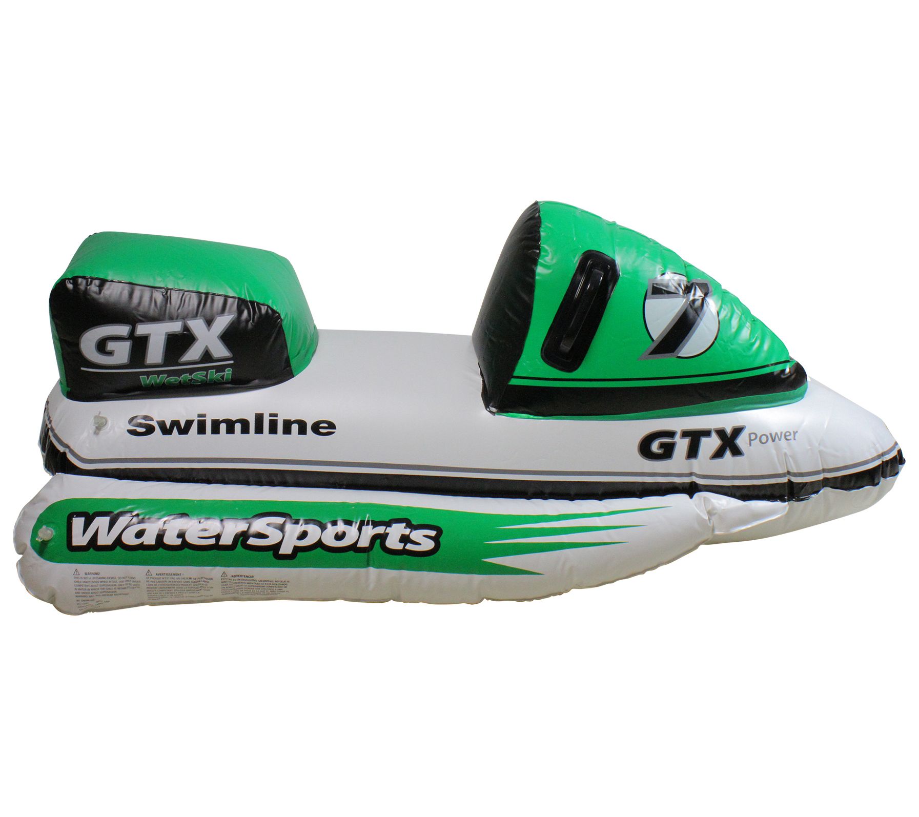 Dive into summer fun with the Swim Central GTX Watersports Pool Float, a vibrant addition to any pool day that lets kids imagine they're racing through the waves on a jet-ski. This green, white, and black float is designed with realistic graphics, including the GTX Power & WaterSports insignia and the number 7, making it a hit for imaginative play. It also features two black handles, a backrest, and side pontoons for added stability during those exciting pool races. From Swim Central.