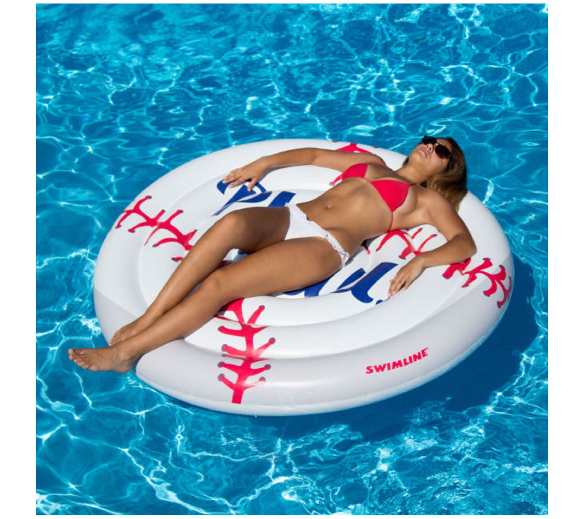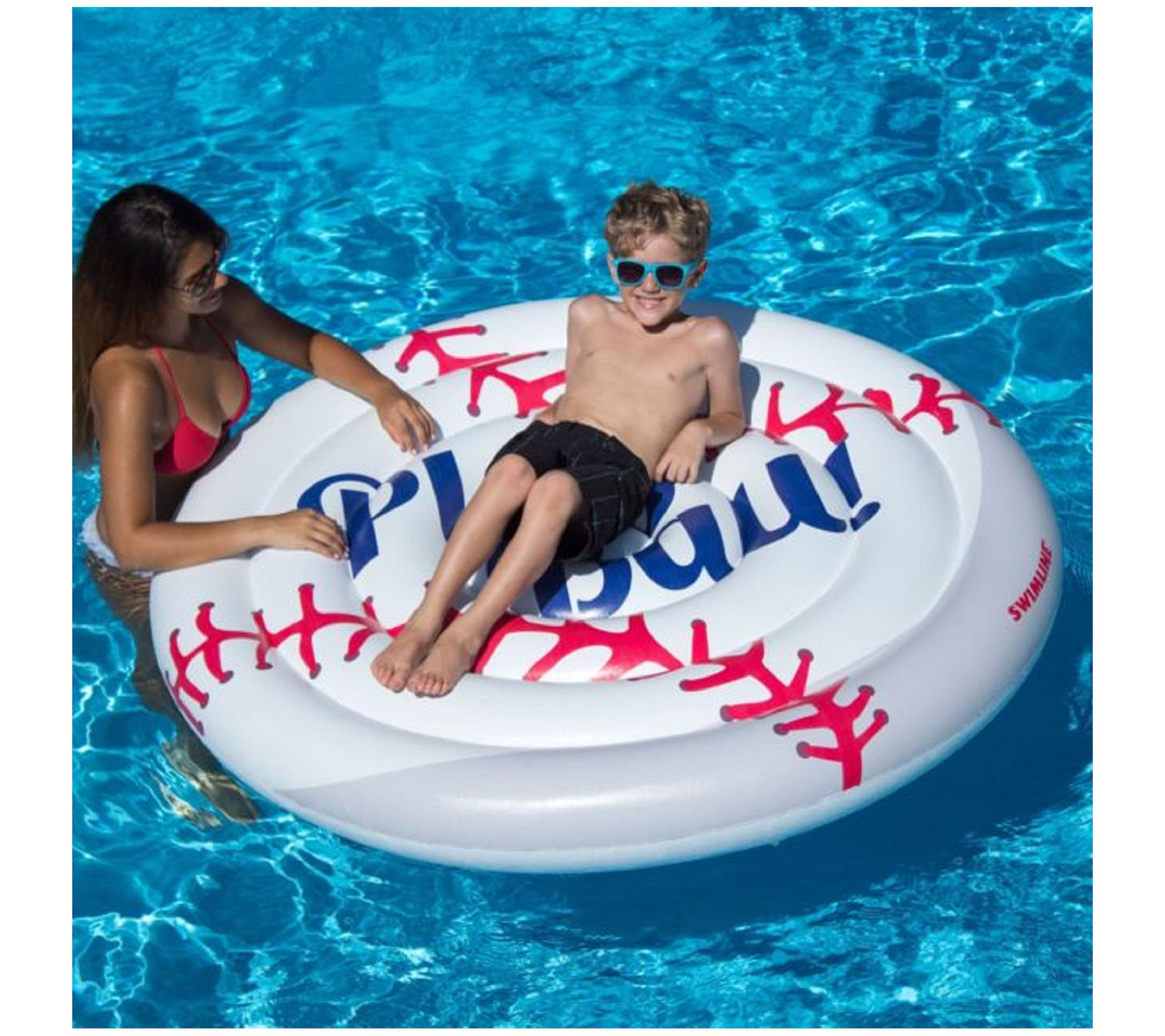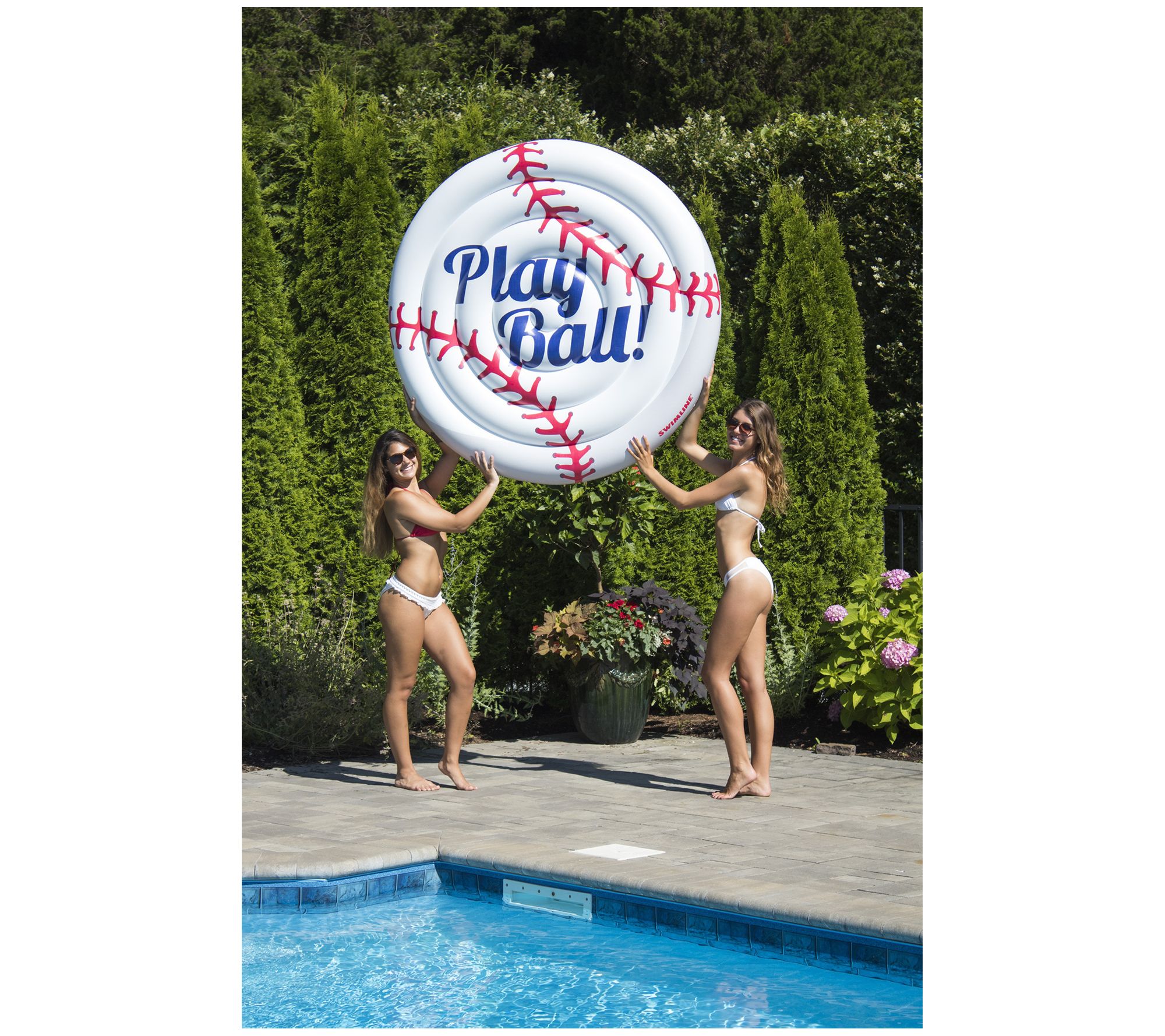 Make a splash this summer with a giant inflatable baseball pool float, a must-have for any sports enthusiast. This novelty lounger, designed to look like a baseball with red stitching and the words "Play Ball!" in the center, is perfect for relaxing in the pool, at the beach, or on the lake. Crafted from sturdy vinyl for durability, it offers a fun and unique way to enjoy the water. From Swim Central.