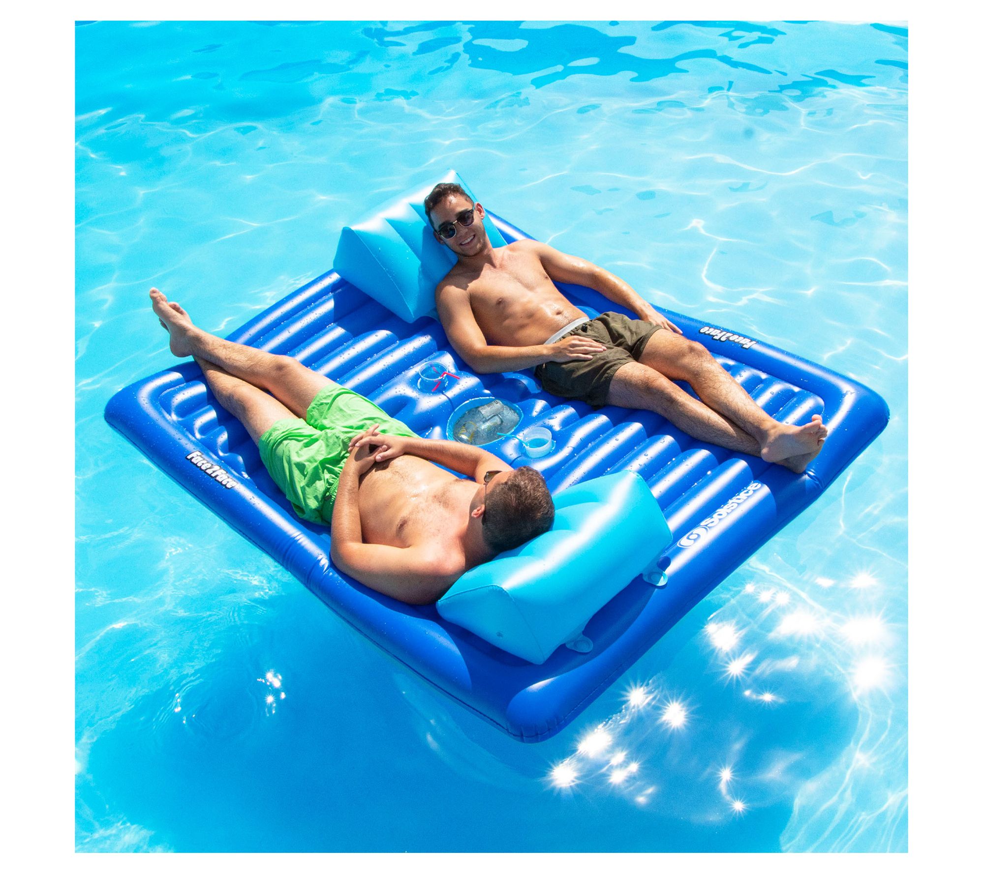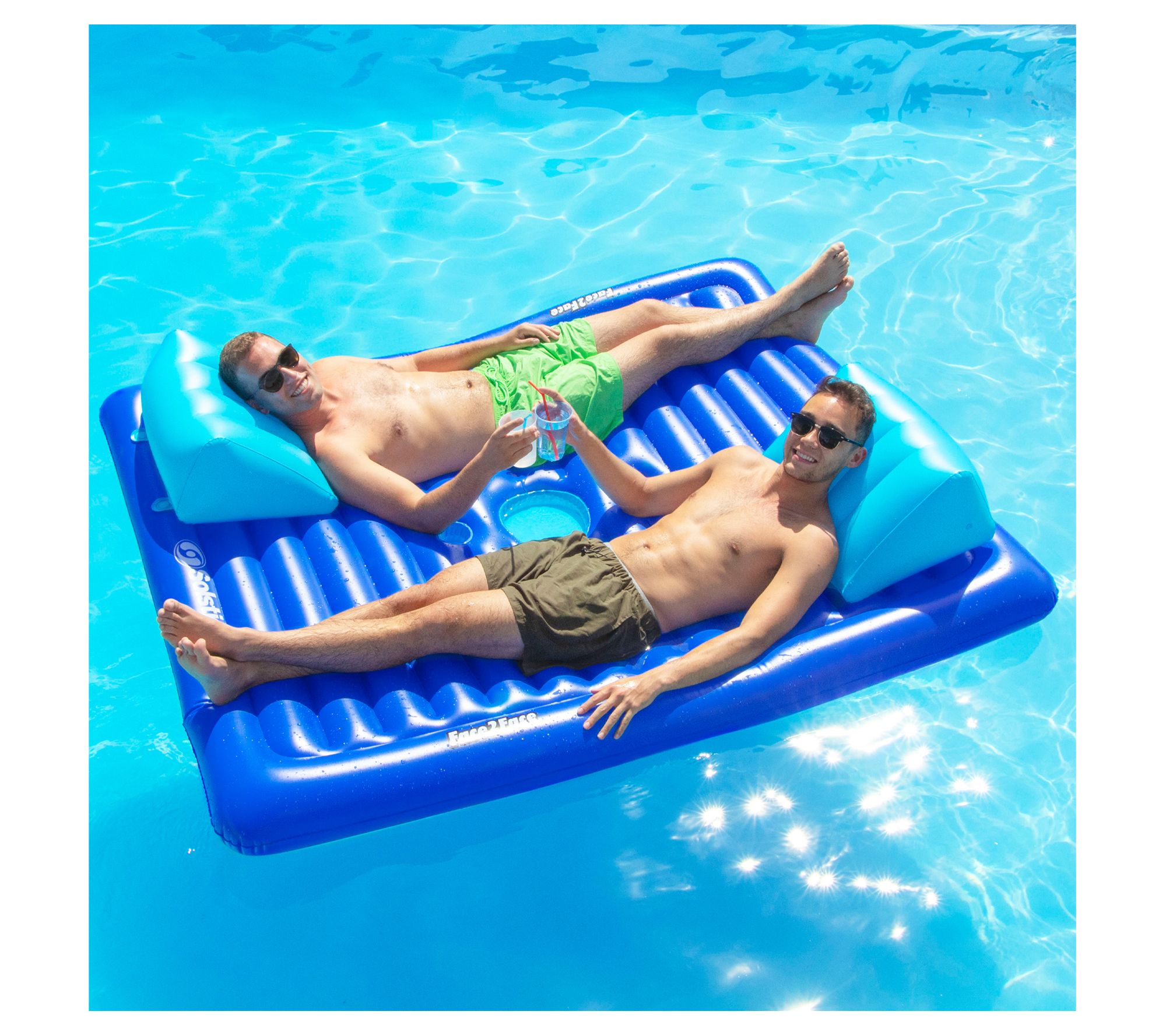 Enjoy relaxation and companionship in the pool with this inflatable dual swimming pool lounger. Designed for two, this lounger features a convenient built-in ice chest and dual cup holders, making it perfect for sipping cold beverages while soaking in the sun. Plus, the bright blue base with light blue pillows and built-in headrests ensure maximum comfort and style during your pool time fun. From Swim Central.