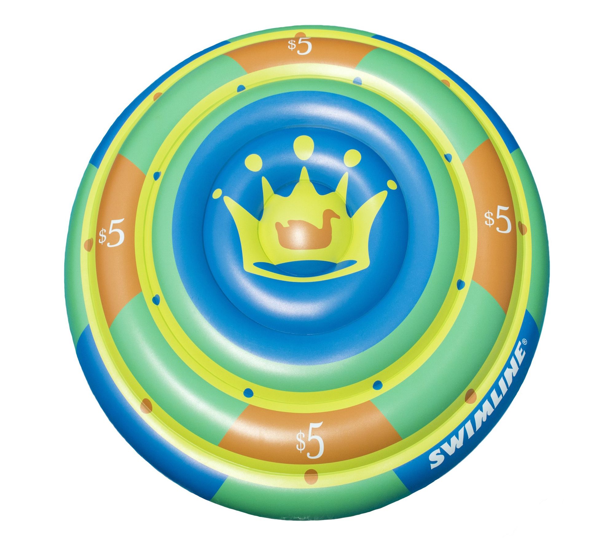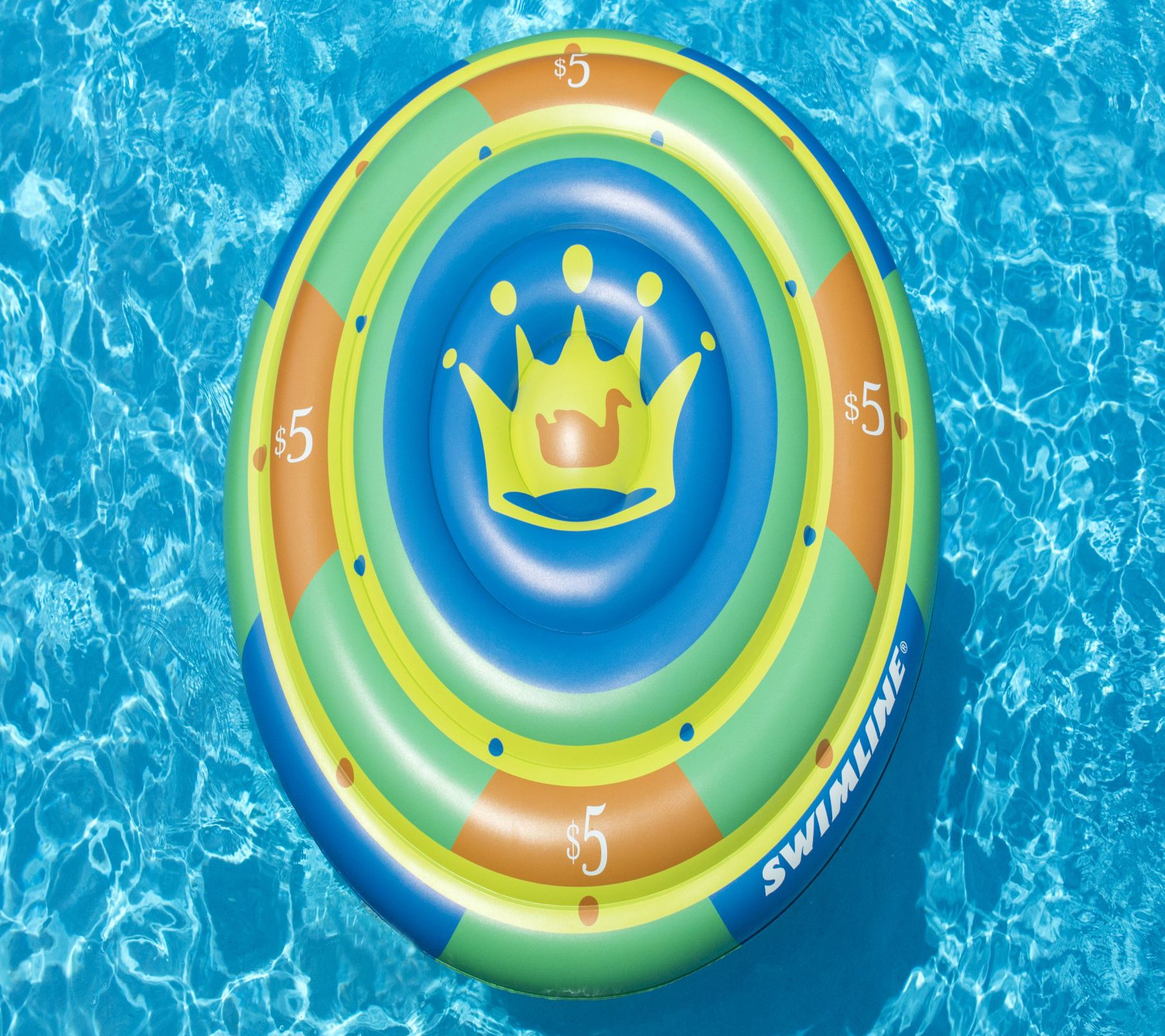 Imagine lounging in style, half-submerged in calming waters, as you let the summer sun envelop you on the playful gambler-themed inflatable. With vibrant green, yellow, orange, and blue hues, that evoke a sense of joy and relaxation, even cooler waters promise to keep you refreshed. Boldly designed as a poker chip featuring regal motifs, this lounge float comfortably accommodates two, making it perfect for sharing leisurely afternoons at the pool. Let the sunlit hours drift by effortlessly. From Swim Central.
