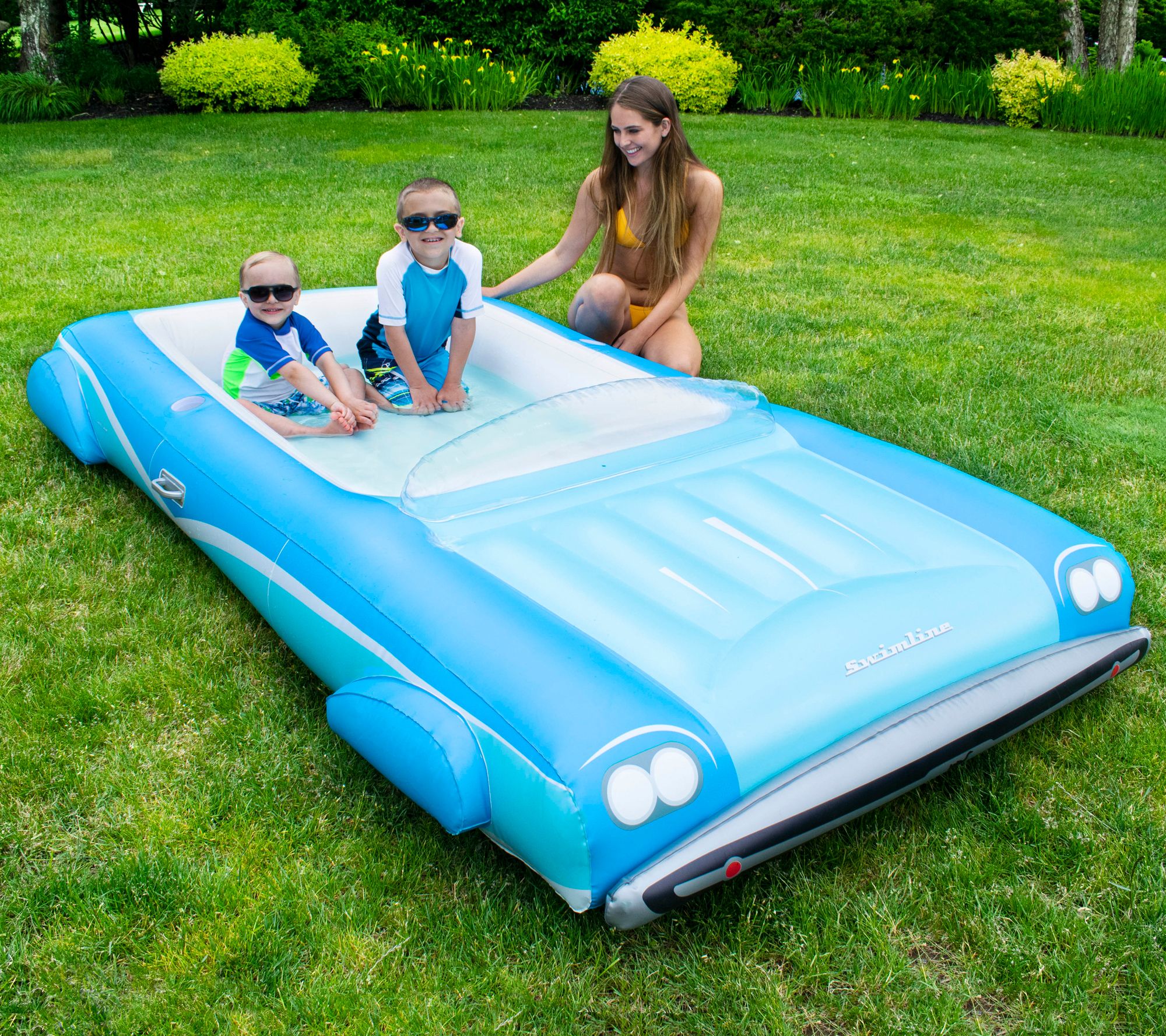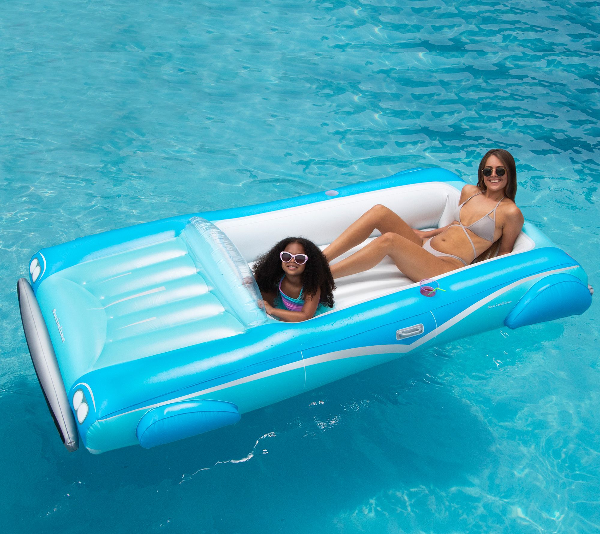 Whether you're gliding across the pool or simply lounging in the backyard, this versatile convertible car float brings a classic touch of fun to any water adventure. Its bold blue and white design, complete with realistic bumpers and rims, turns heads while offering cozy cup holders for your refreshments. Use it as a float on the lake or convert it into a kiddie pool on a sunny lawn. From Swim Central.
