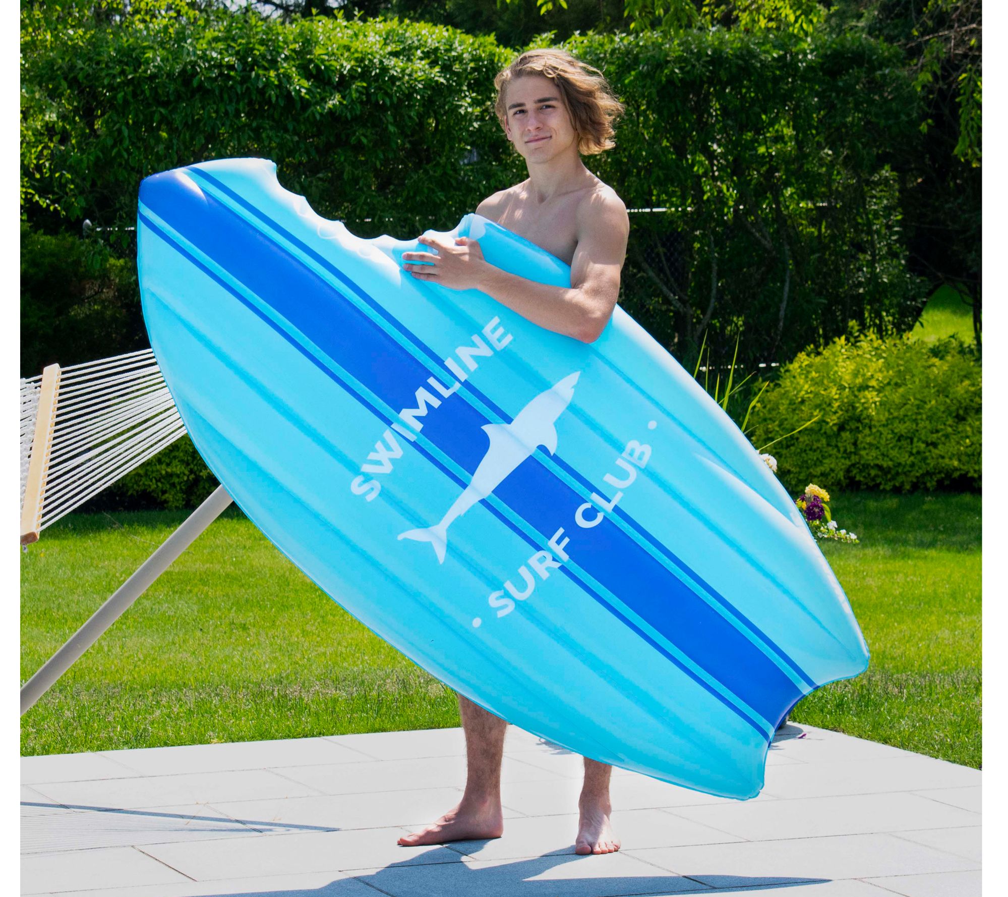 Bring excitement to your pool days with this fun inflatable raft, designed to let you ride the waves like a pro surfer. The playful shark bite detail and surf club logo add to an adventurous vibe, transporting you straight to the beach. Easy to inflate and ready for use both indoors and outdoors, this pool float promises loads of enjoyable moments under the sun. From Swimline.
