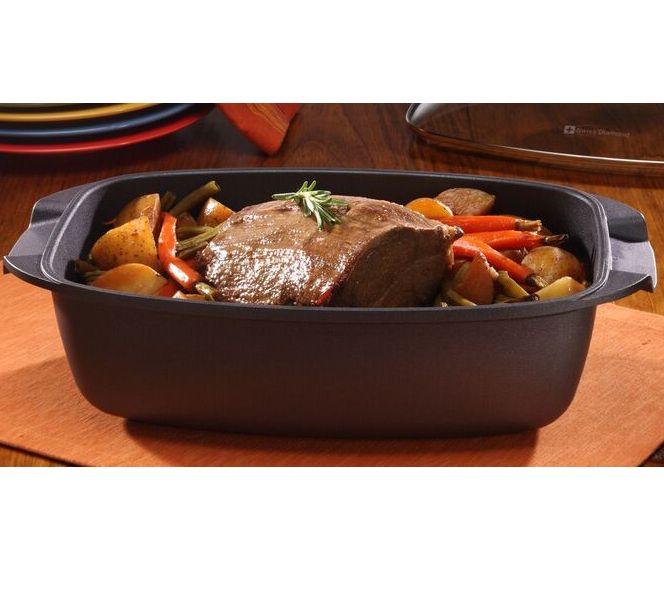 A versatile vessel, this durable lidded roaster by Swiss Diamond makes the most of your mealtime prep work. Sear a roast on the stovetop, put it in the oven to cook, then return the pan to the stovetop to make gravy. Its ample size also easily cooks chili, casseroles, and more, then cleans up in a snap! From Swiss Diamond.