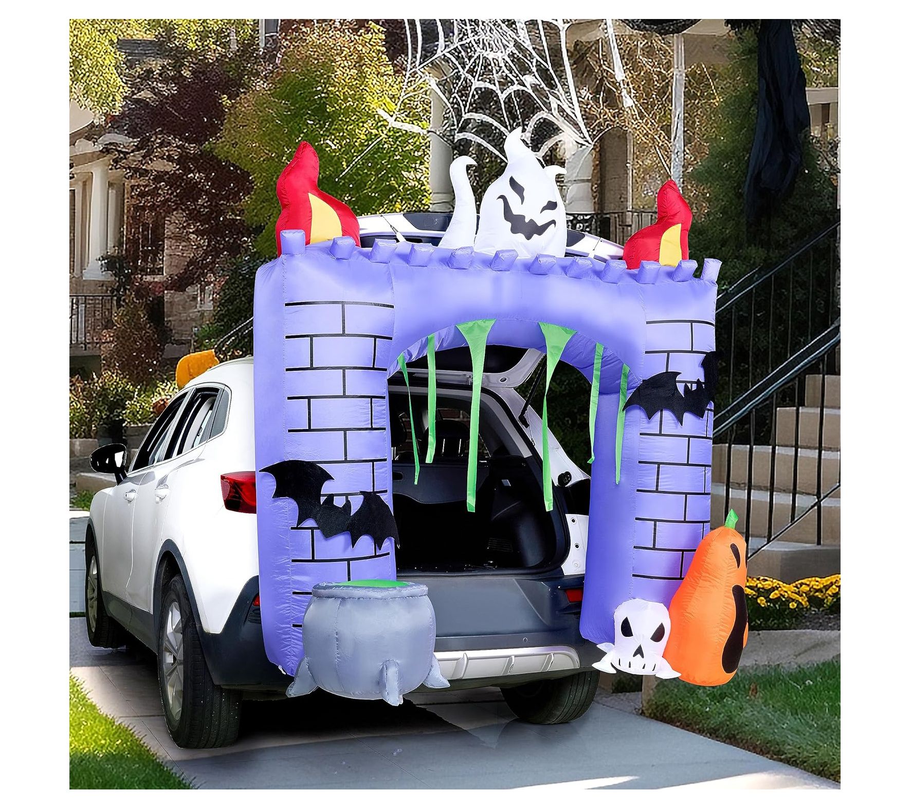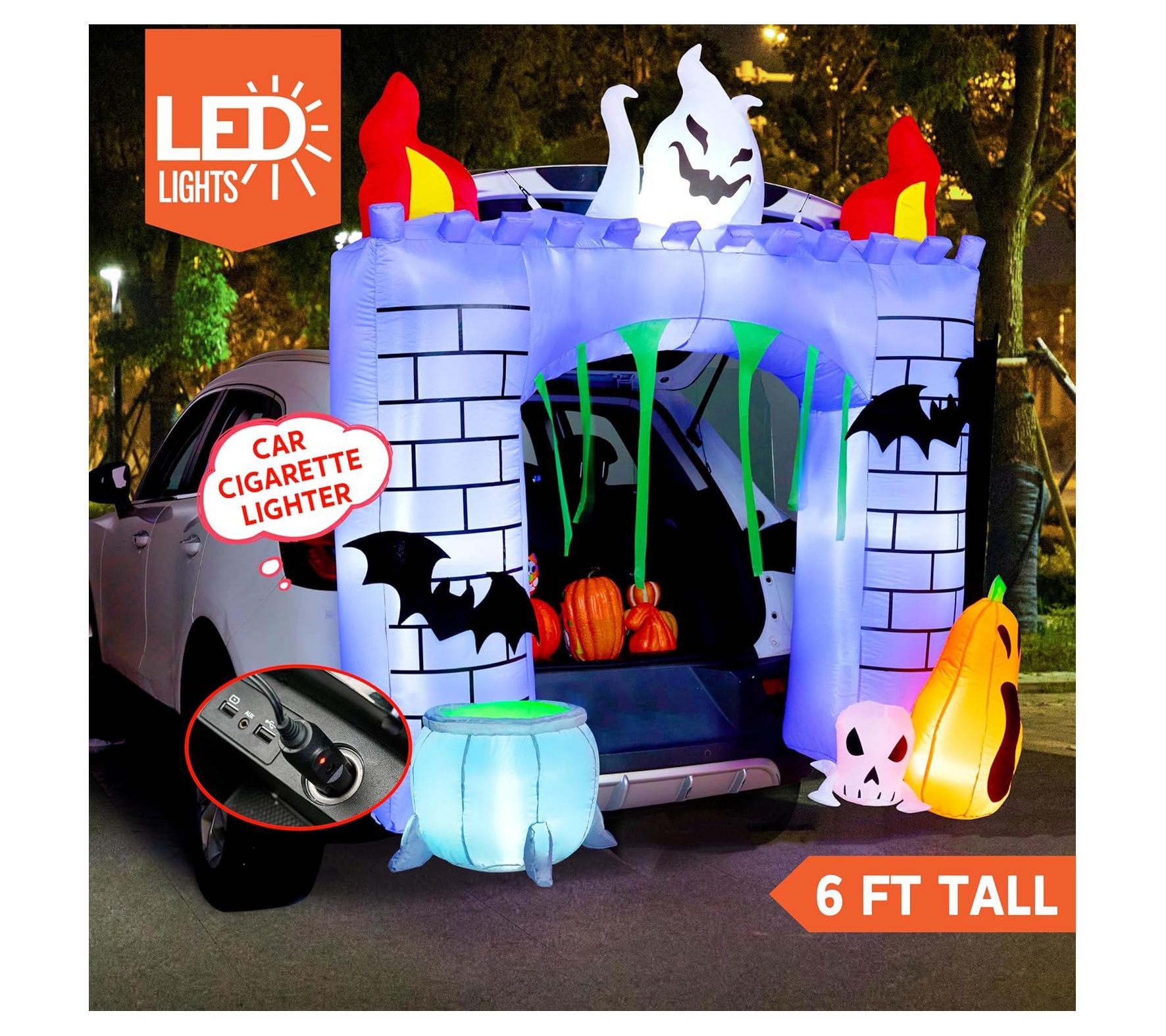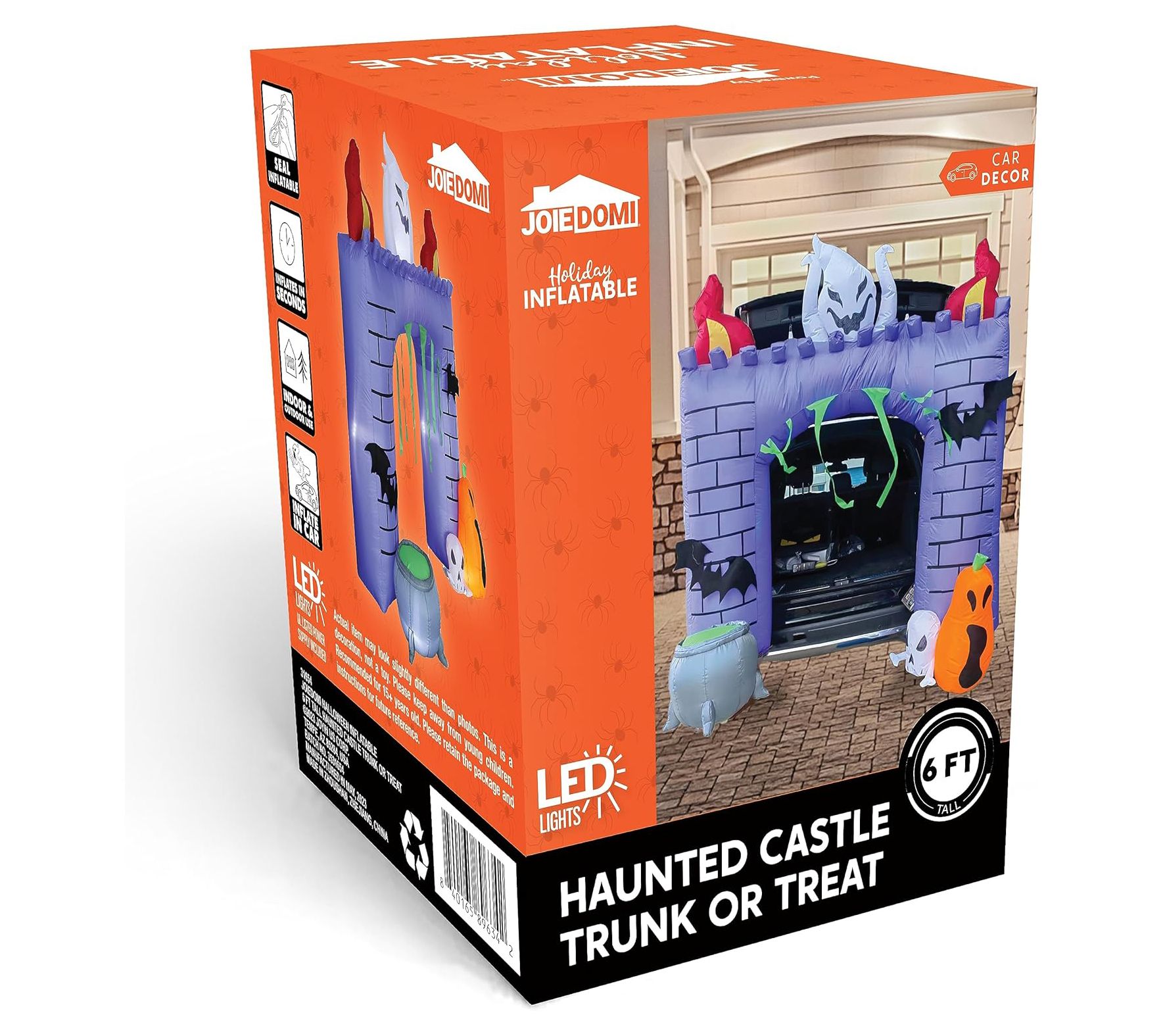 Create a fun and festive Halloween display with the Syncfun 6' Halloween inflatable haunted castle. This inflatable decoration features built-in LED lights, casting a bright white glow that will captivate and delight trick-or-treaters. Simply plug it in, and watch as the castle inflates, making setup a breeze. From Syncfun.