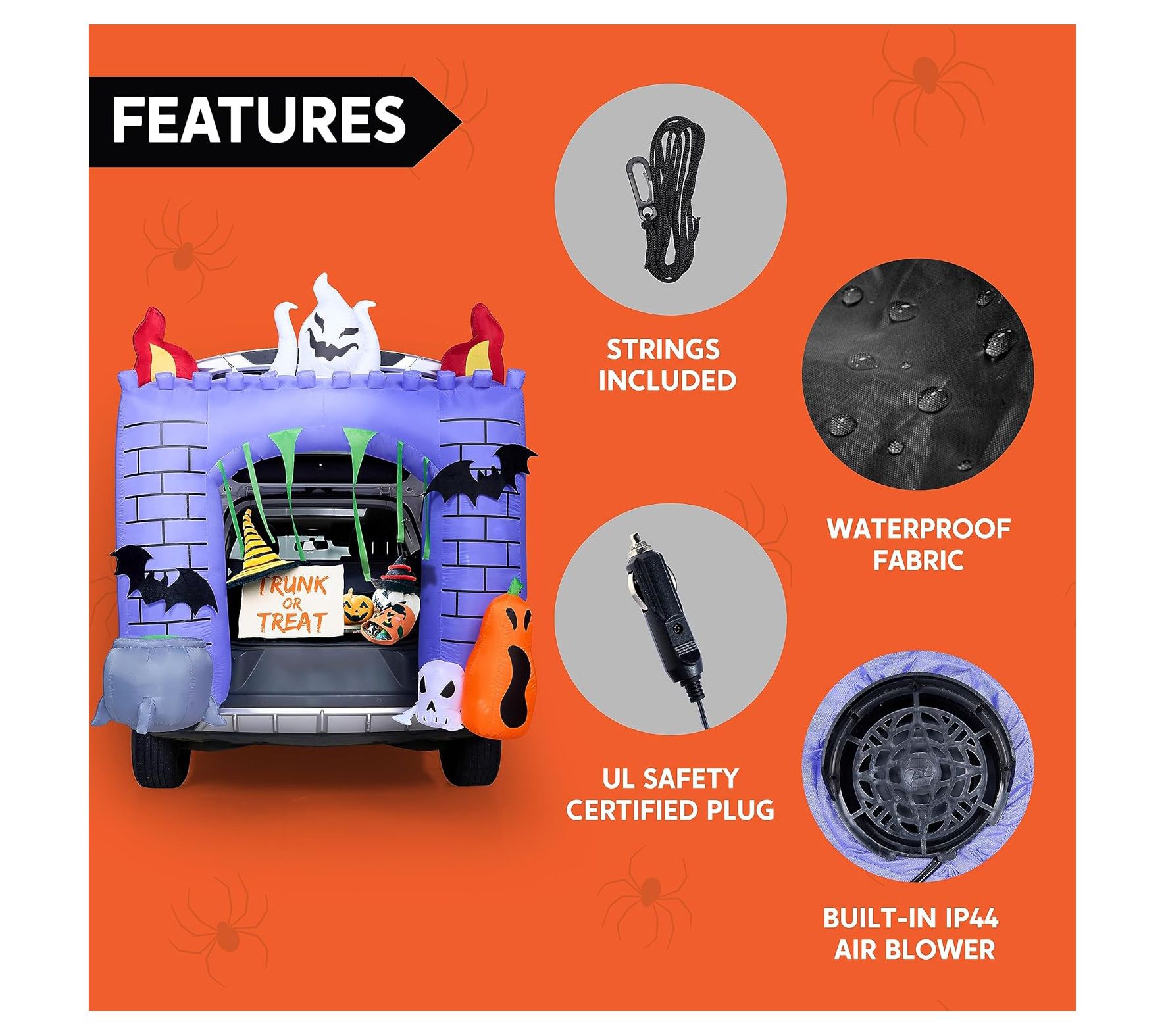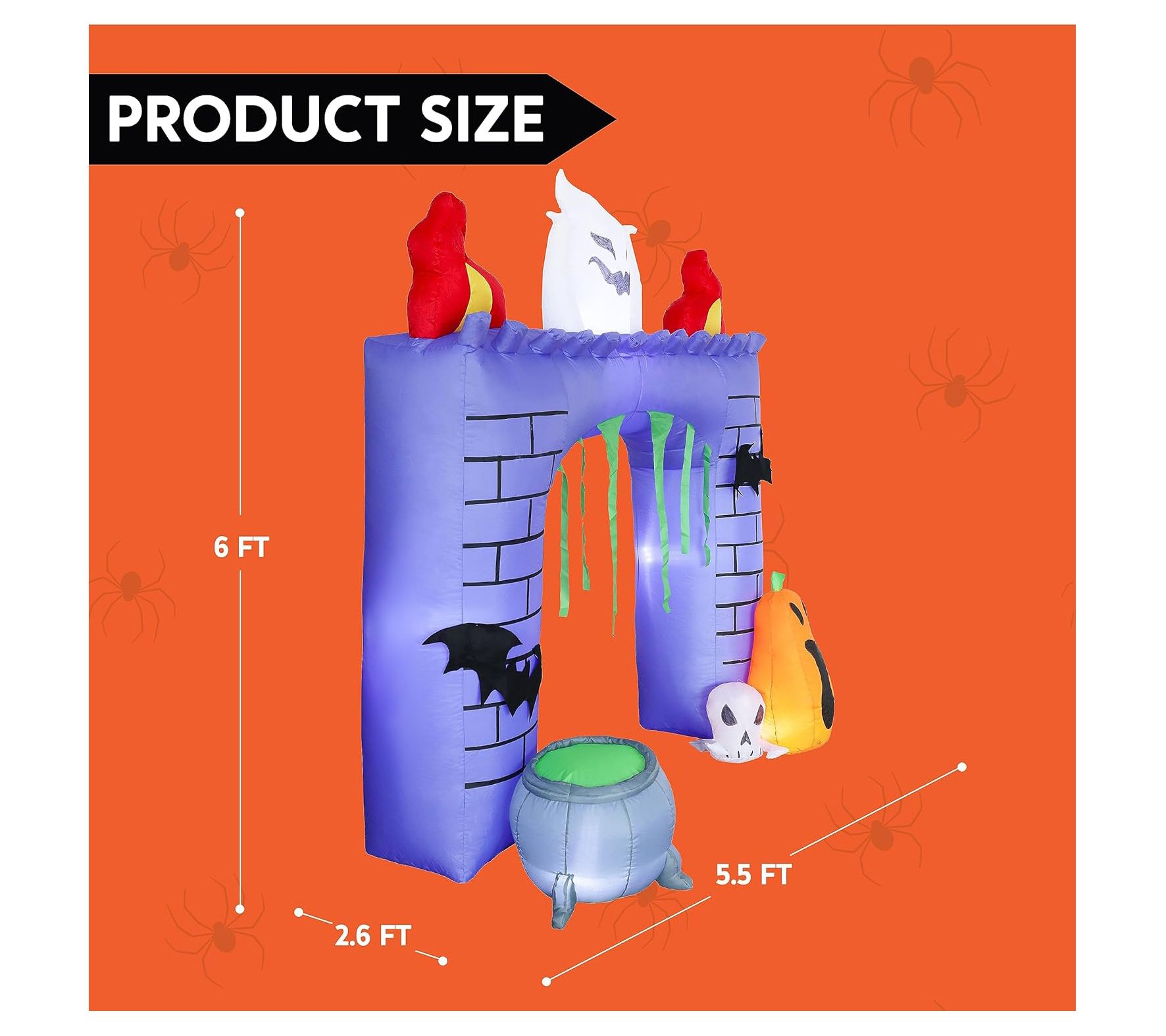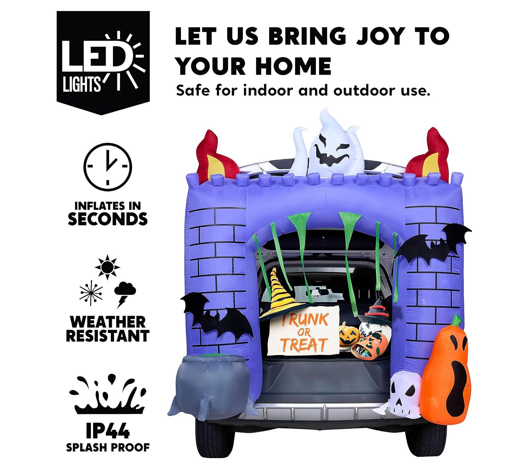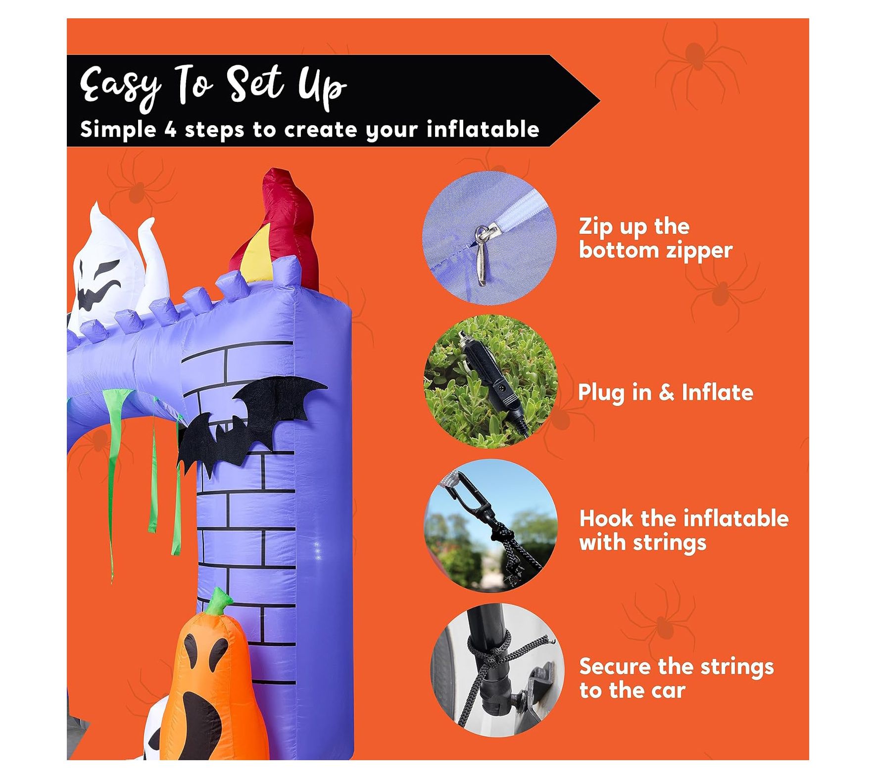 Create a fun and festive Halloween display with the Syncfun 6' Halloween inflatable haunted castle. This inflatable decoration features built-in LED lights, casting a bright white glow that will captivate and delight trick-or-treaters. Simply plug it in, and watch as the castle inflates, making setup a breeze. From Syncfun.
