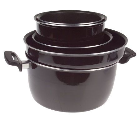 No more clutter in your cabinets. This 10-piece T-Fal cookware set stacks neatly for easy storage. Removable handles allow the pans to nest within each other. Each pan is equipped with Thermospot technology that lets you know when they're properly pre-heated. Aluminum with hard porcelain enamel exteriors. Nonstick interiors. Includes anti-splatter lids and plastic storage lids for leftovers. Dishwasher safe.