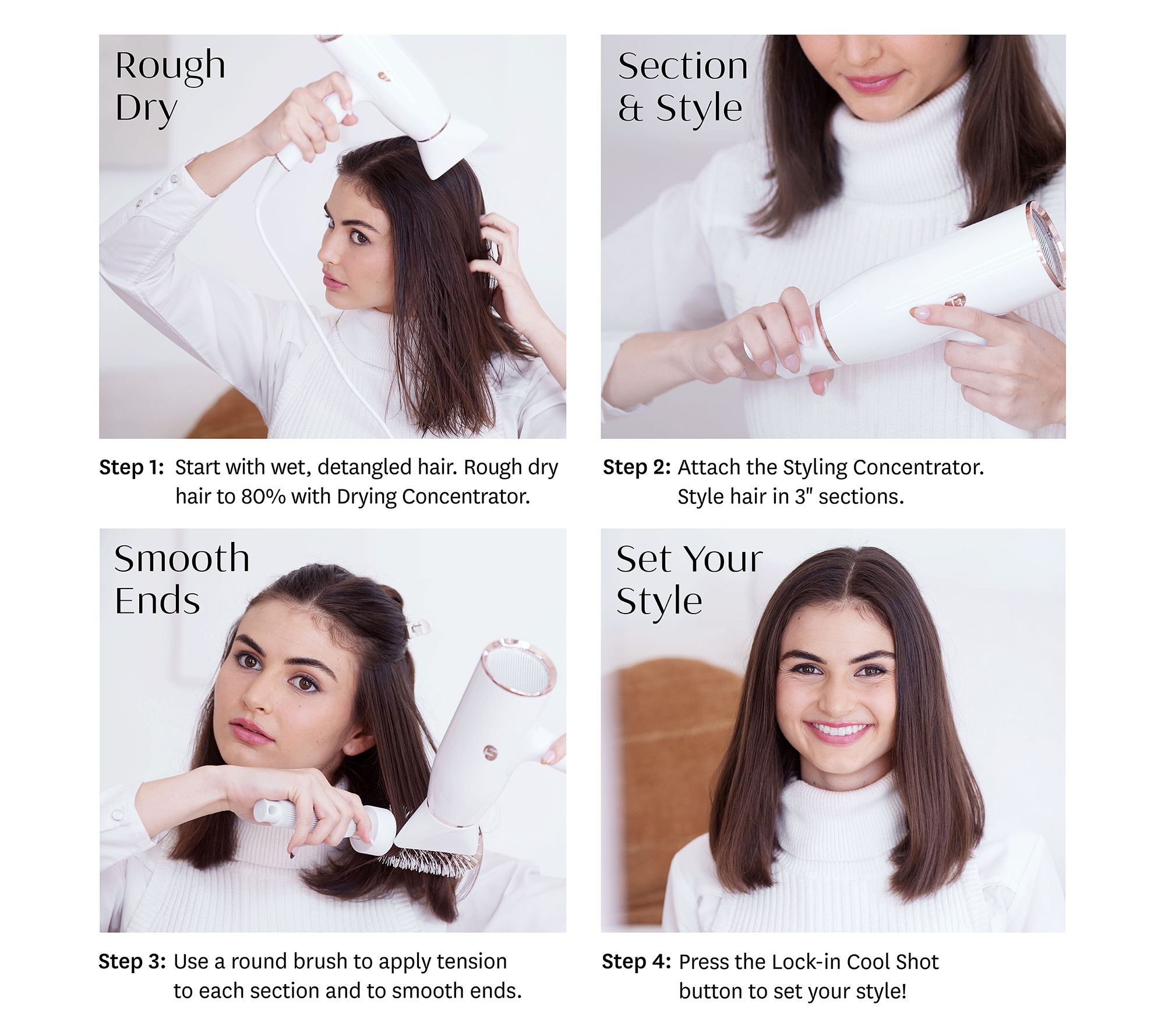 How do I use it: Select your desired heat and speed settings. Using the drying concentrator, rough dry hair until it is 80% dry. To style, attach the styling concentrator, then divide hair into 3" to 4" sections. Place a barrel brush beneath the first section, starting at the root. Follow the brush with the lightweight hair dryer, pulling through to the ends of the hair. When you reach the ends, roll hair back up to your head and hold. Continue styling this way until the section is dry. Release and move on to the next section. Press the Lock-in Cool Shot button to set your style with cool air.