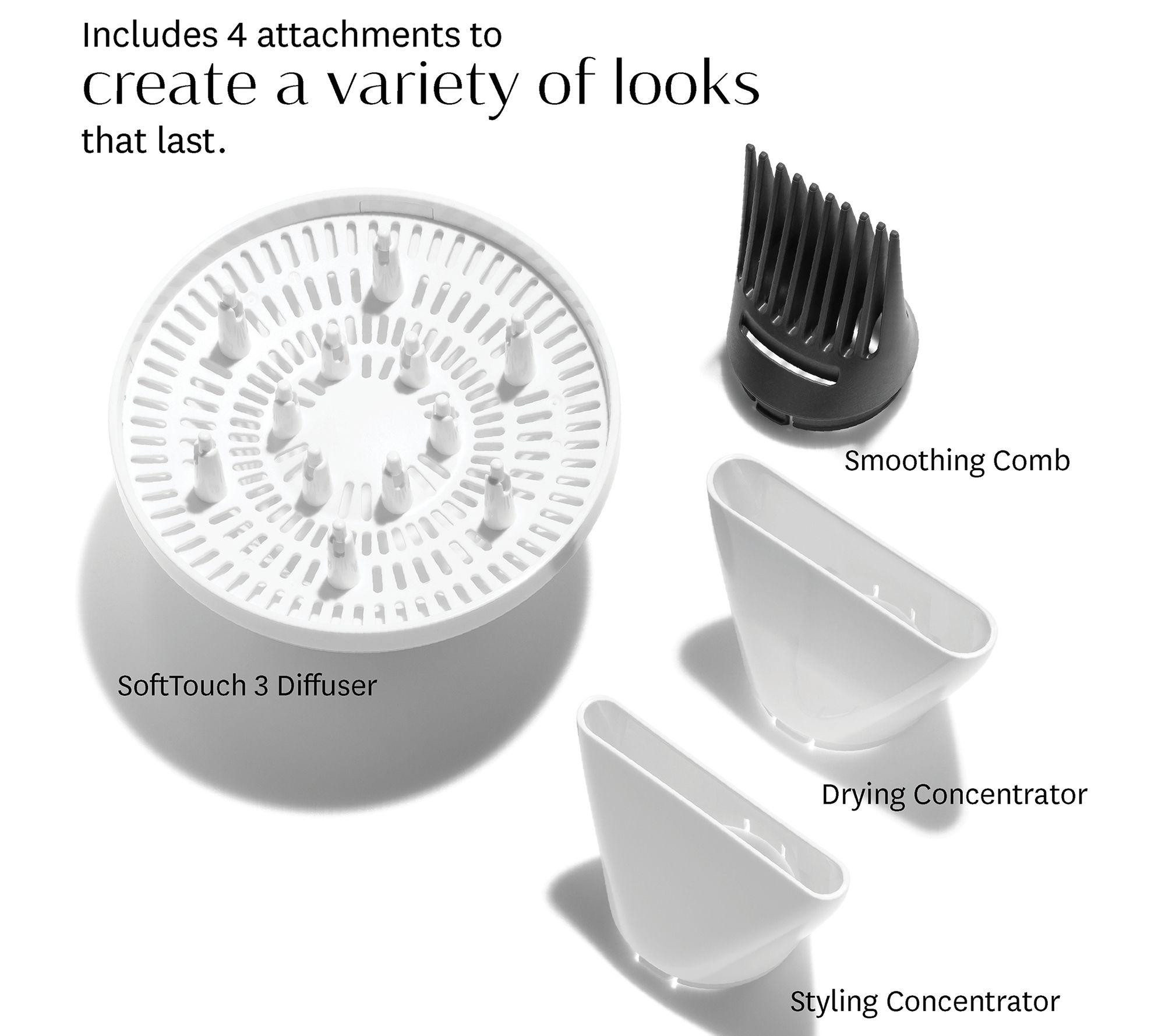 Includes Featherweight StyleMax hair dryer, wide drying nozzle, narrow drying nozzle, smoothing comb, and soft touch diffuser