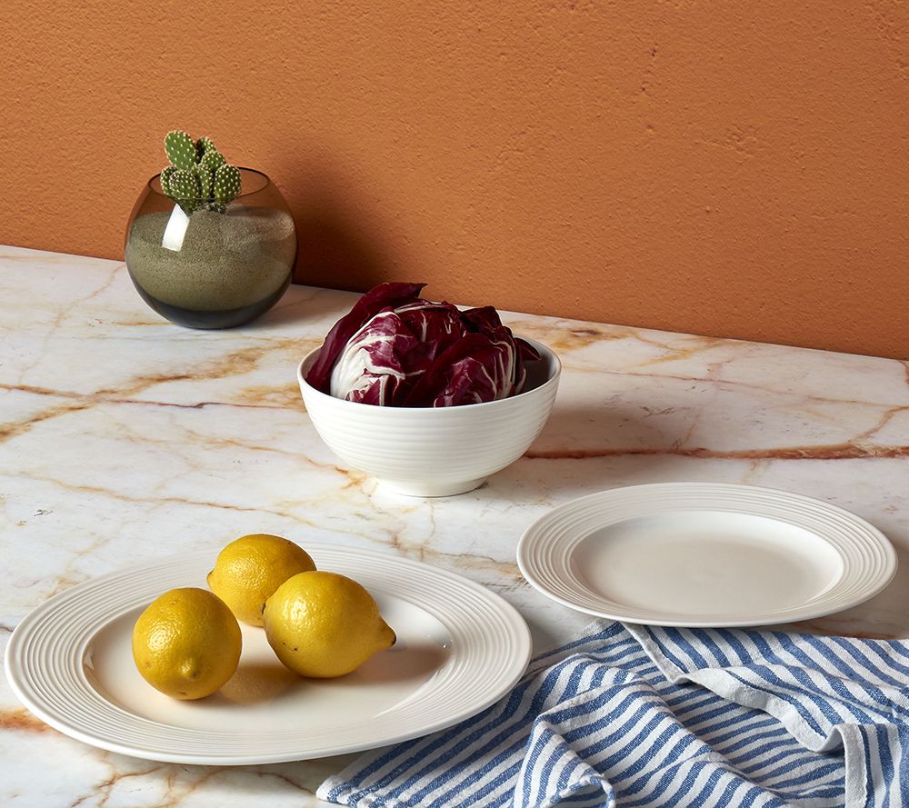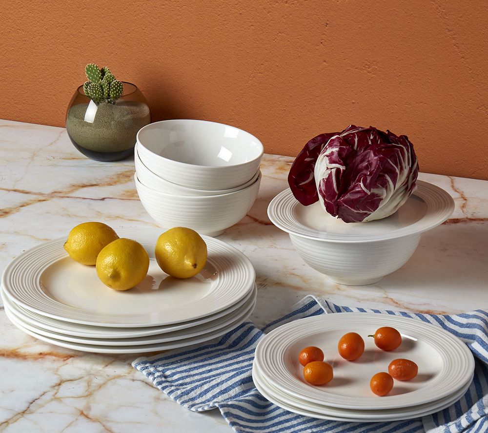 Indulge in chic design with this 12-piece dinnerware set. Crafted from high-fired vitrified porcelain, it's a durable yet stylish complement for any decor. From Tabletops Gallery.